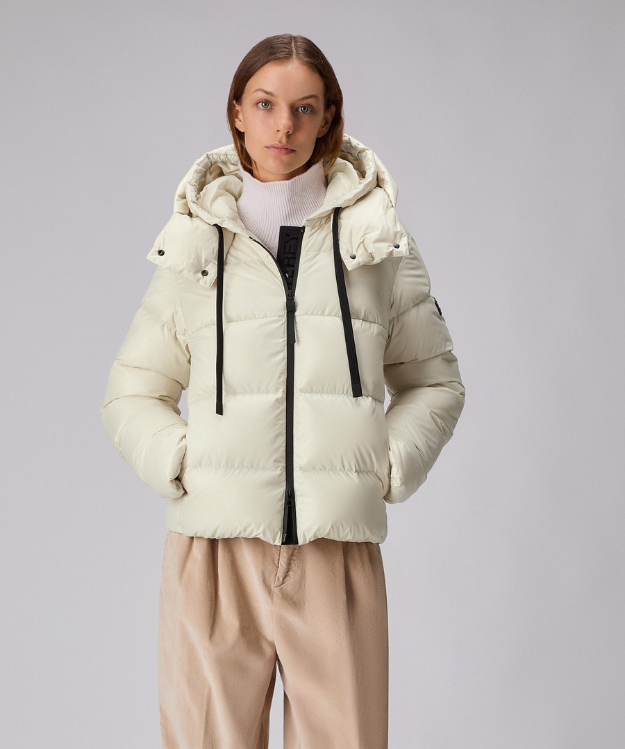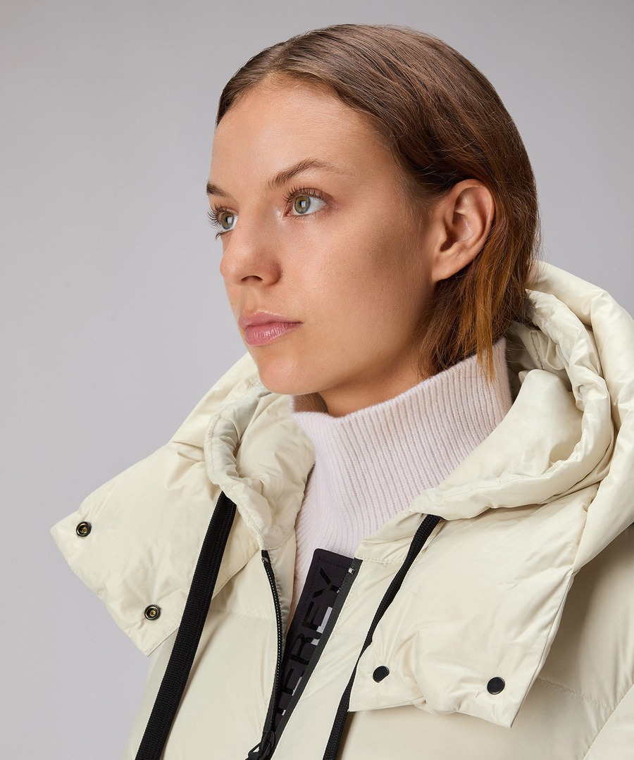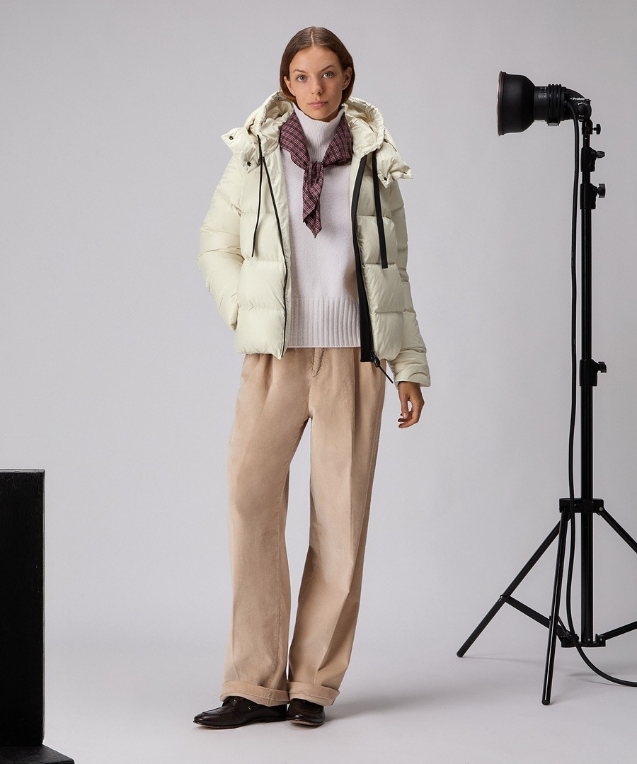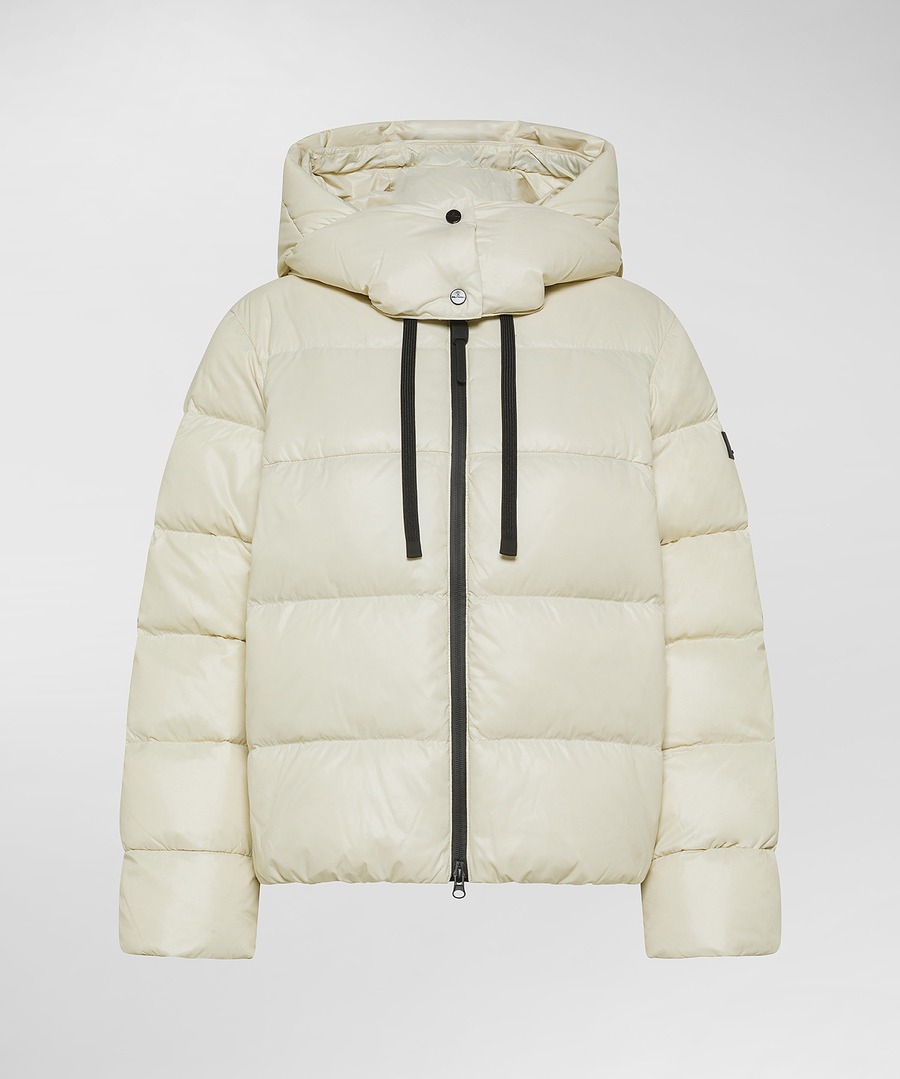 Puffer jacket ad ampie trapunte dal volume moderno, realizzato in nylon lucido dalla particolare morbidezza grazie a degli speciali trattamenti subiti. L’imbottitura diretta in piuma naturale certificata garantisce calore e leggerezza, mentre il doppio cappuccio – uno interno fisso e uno esterno removibile – offre massima protezione e adattabilità. Il collo alto con bottoni a pressione, la full zip centrale a doppio cursore a vista, in contrasto colore nero, e le ampie tasche laterali completano un capo pratico e distintivo, perfetto per uno stile urbano con attitudine outdoor. l tessuto è trattato con finitura idrorepellente.