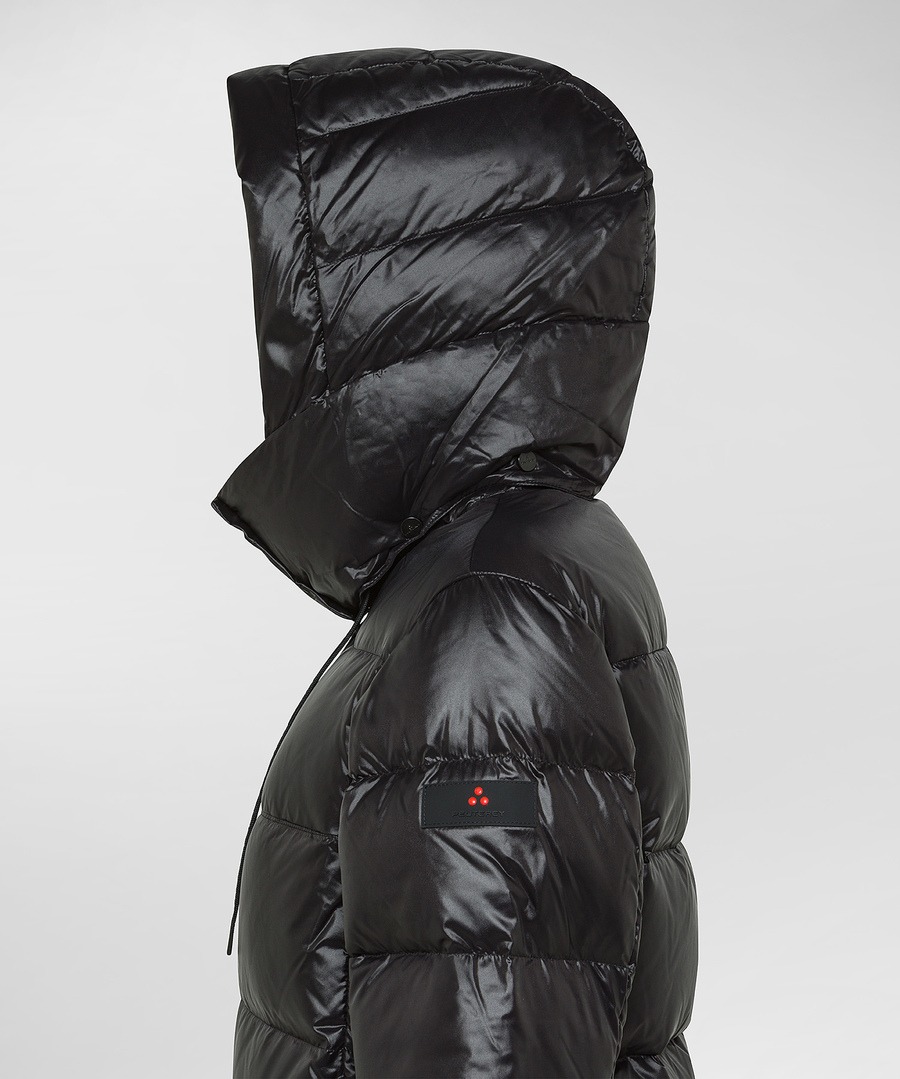 Puffer jacket ad ampie trapunte dal volume moderno, realizzato in nylon lucido dalla particolare morbidezza grazie a degli speciali trattamenti subiti. L’imbottitura diretta in piuma naturale certificata garantisce calore e leggerezza, mentre il doppio cappuccio – uno interno fisso e uno esterno removibile – offre massima protezione e adattabilità. Il collo alto con bottoni a pressione, la full zip centrale a doppio cursore a vista, in contrasto colore nero, e le ampie tasche laterali completano un capo pratico e distintivo, perfetto per uno stile urbano con attitudine outdoor. l tessuto è trattato con finitura idrorepellente.