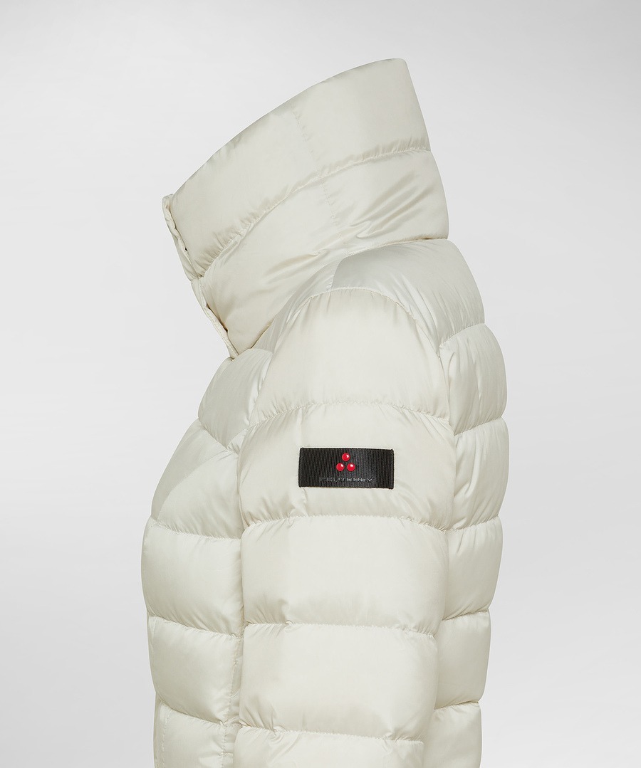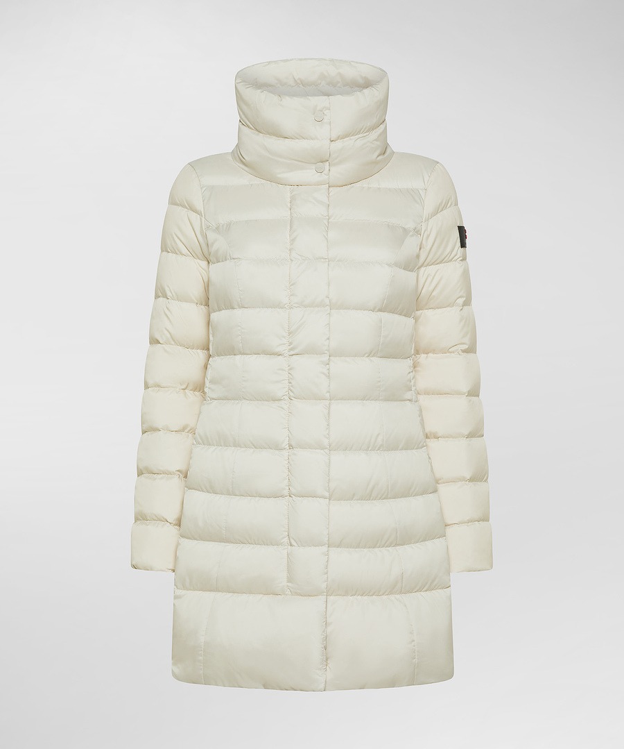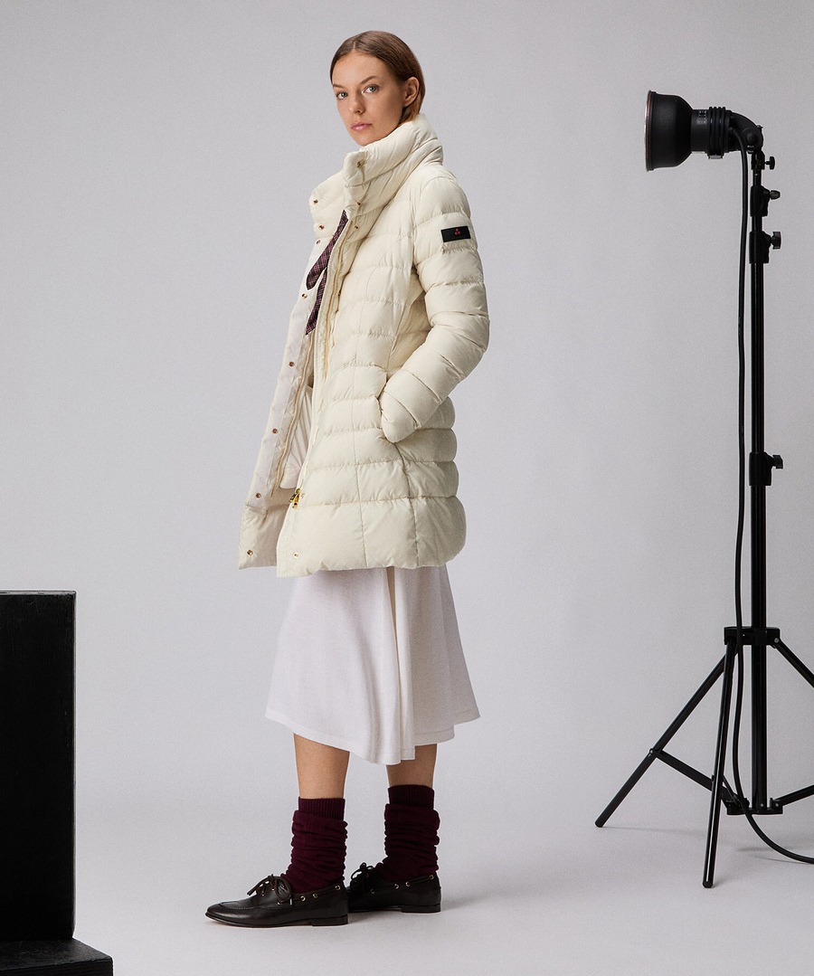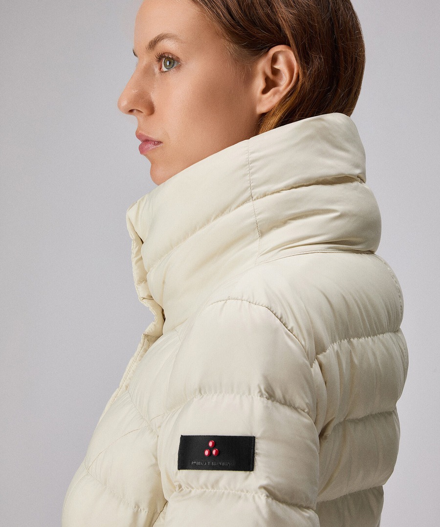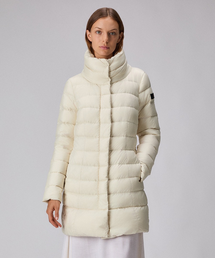 Piumino lungo a colo alto in tessuto super-light a canali stretti, realizzato in 100% poliestere riciclato da materiali post consumo, con finitura semi-opaca e struttura ultra compatta. Morbido e fluido al tatto, è trattato con tecnologia PFC Free che garantisce idrorepellenza senza ricorrere a sostanze chimiche nocive. L’imbottitura in piuma naturale certificata crea un volume soffice, leggero e caldo. Il design, essenziale e femminile, è definito da piccole trapunte sul busto e un’ampia trapunta sul fondo che dona un volume elegante e moderno. La chiusura frontale, con zip a doppio cursore e bottoni a pressione, è nascosta da patta, mentre due ampie tasche laterali altezza fianchi completano la funzionalità. Un classico Peuterey rivisitato e arricchito di dettagli, un must have di stagione.