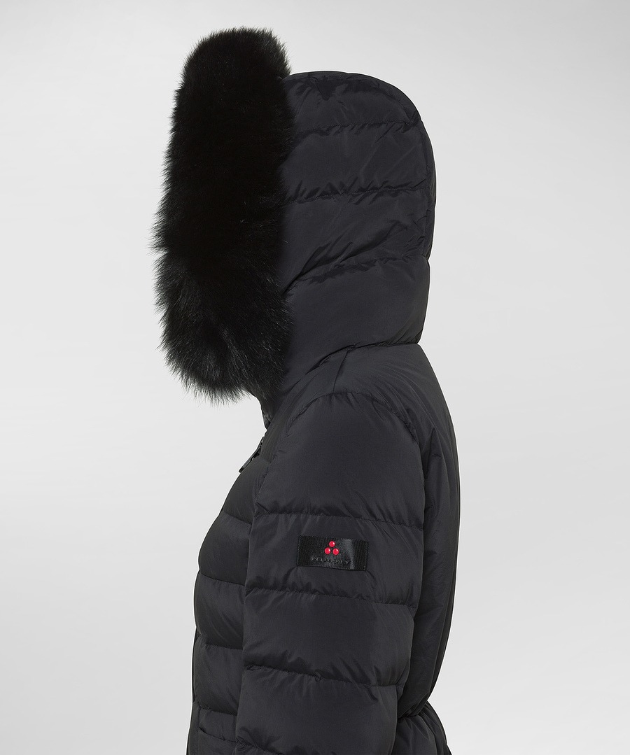 Piumino corto e soffice, realizzato in popeline leggero di nylon e microfibra di poliestere, lavorato ad alta temperatura per ottenere una mano sostenuta e un tatto polveroso, ulteriormente ammorbidito da un trattamento finale al silicone. L’imbottitura a canali in piuma naturale certificata assicura calore e leggerezza, mentre il cappuccio con bordo in pelliccia di volpe, removibile, aggiunge un tocco sofisticato. La zip centrale asimmetrica dona movimento alla shape essenziale e femminile del capo completata da collo con doppio bottone a pressione in tono e tasche laterali con chiusura a pressione nascosta. Water repellent, pensato per accompagnare i tuoi movimenti, garantendo massima protezione nelle giornate più fredde.