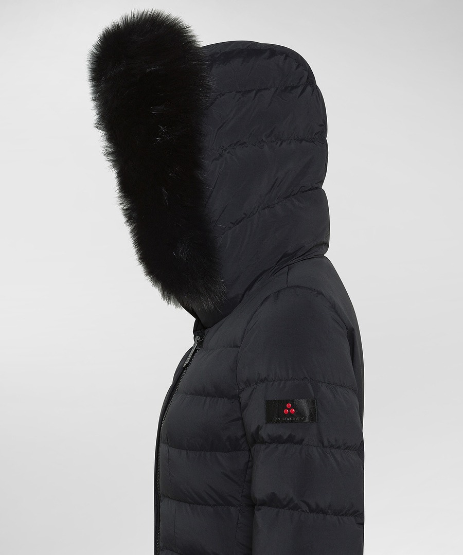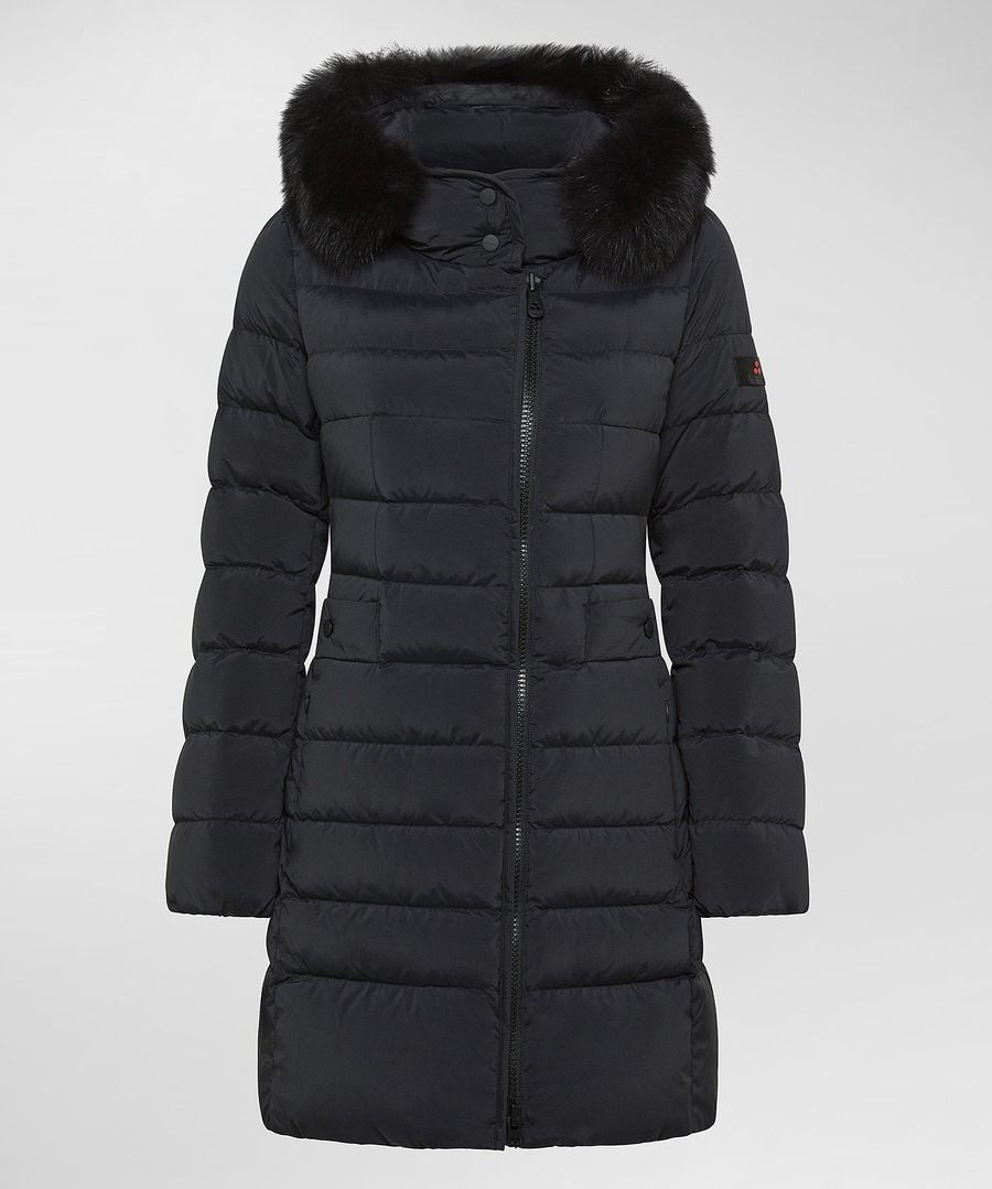 Piumino lungo trapuntato in leggero popeline di nylon e microfibra di poliestere, trattato ad alta temperatura per ottenere una mano sostenuta e un tatto polveroso, poi reso estremamente morbido grazie a un finissaggio al silicone. L’imbottitura in piuma naturale certificata assicura protezione termica con leggerezza, mentre il trattamento idrorepellente mantiene il comfort anche in caso di pioggia leggera. Il design è definito da una zip centrale a doppio cursore, collo avvolgente con bottoni a pressione tono su tono e cappuccio con bordo in pelliccia di volpe, removibile. Le tasche laterali con bottone a pressione completano un capo raffinato e funzionale, perfetto per l’inverno in città. Un modello iconico del brand, reinterpretato con dettagli moderni ed ancora più raffinati.