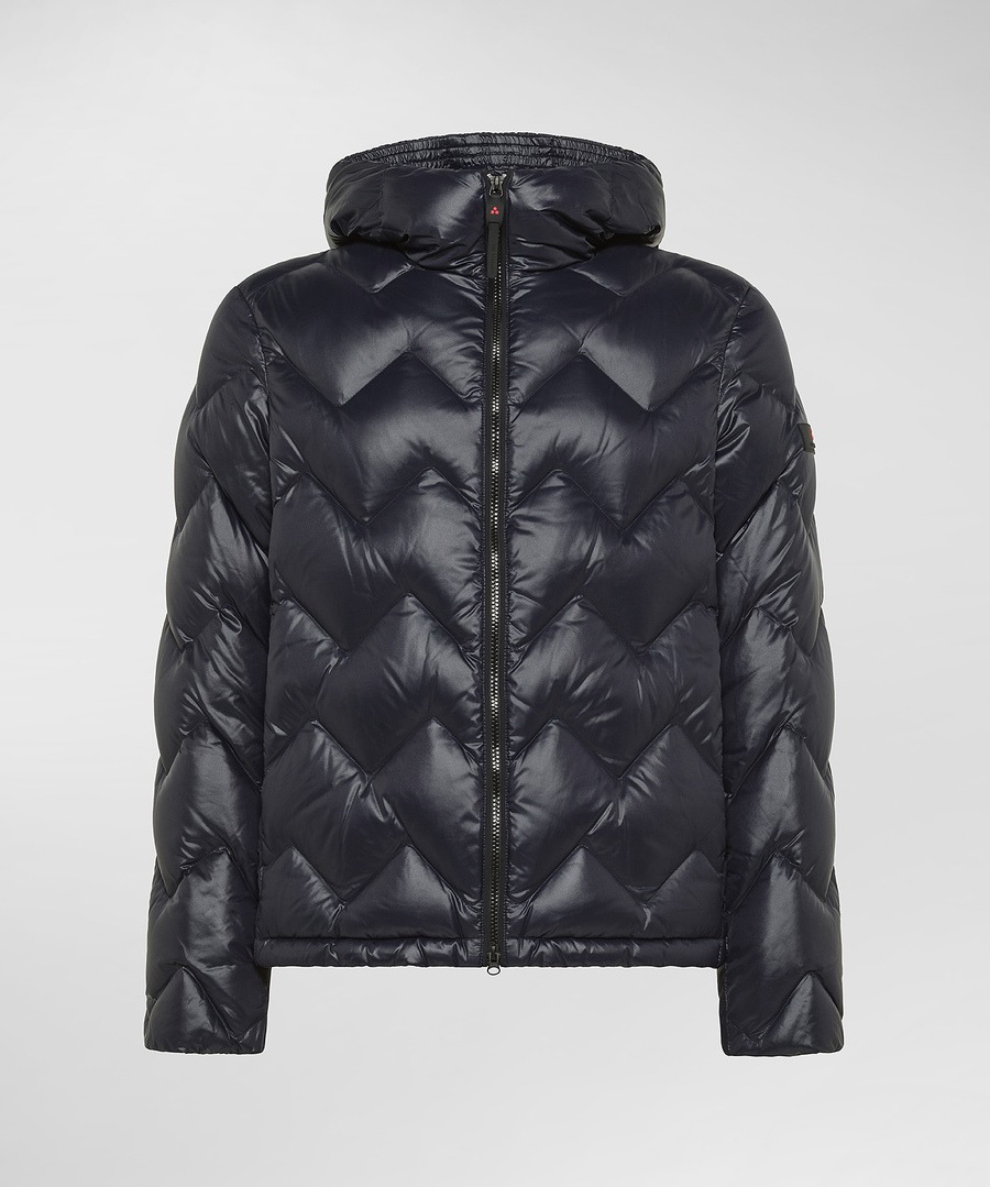 Piumino corto in nylon super leggero, caratterizzato da una particolare lucentezza e da una mano fluida e morbida. La trapunta a motivo chevron, dinamica e grafica, dona al capo un carattere distintivo. Parte della linea Color in cui i disegni geometrici prendono vita ed esaltano i piumini della sezione, un concept giocoso e ironico che reinterpreta il capospalla in modo creativo ed easy. L’imbottitura in piuma naturale certificata garantisce calore e leggerezza ideali durante la stagione fredda. Il cappuccio fisso regolabile, la full zip centrale a doppio cursore e i dettagli neri a contrasto completano un look dinamico e moderno. Parte della linea Color, questo piumino, wind resistant e water repellent, interpreta il capospalla in modo creativo e giocoso, con un’estetica distintiva e immediata, ideale per chi non ama passare.