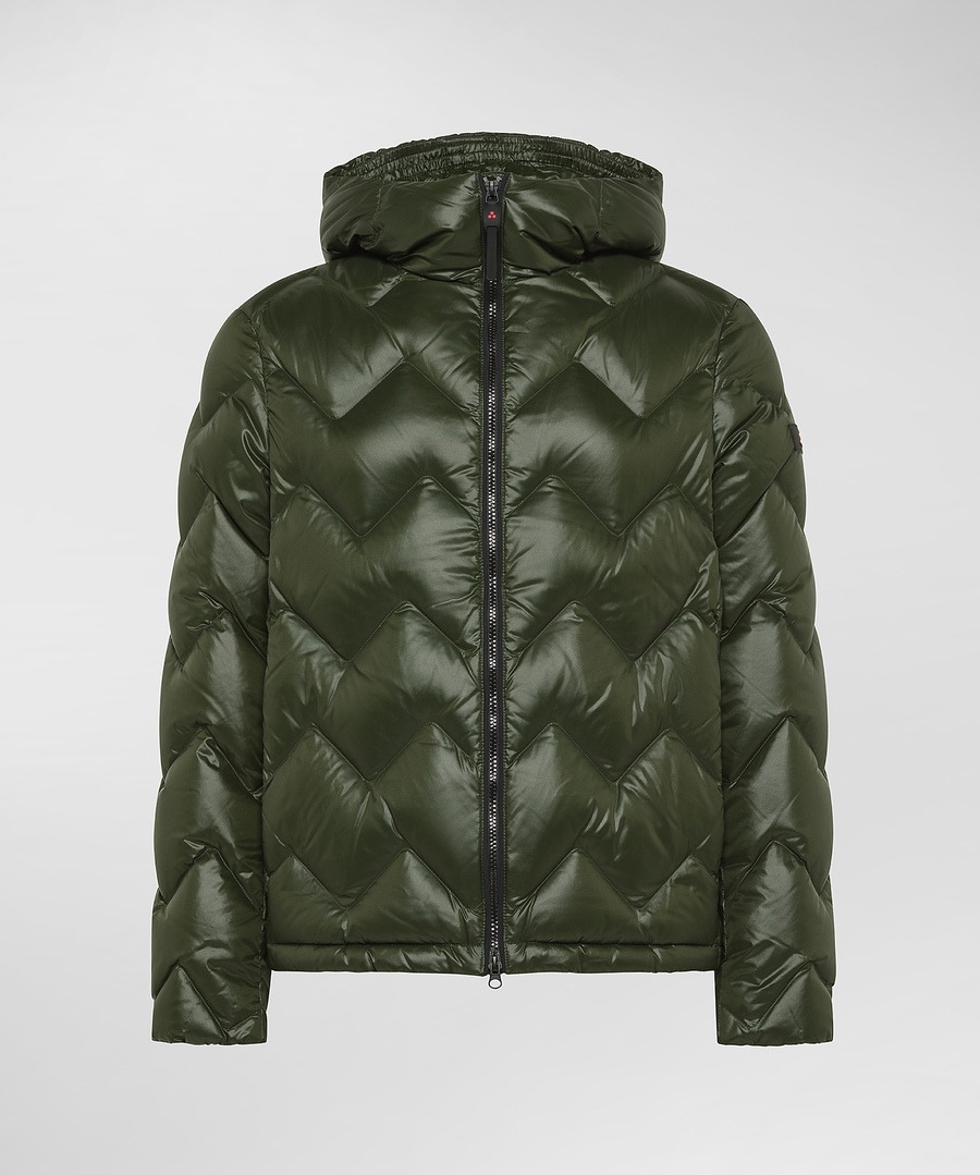 Piumino corto in nylon super leggero, caratterizzato da una particolare lucentezza e da una mano fluida e morbida. La trapunta a motivo chevron, dinamica e grafica, dona al capo un carattere distintivo. Parte della linea Color in cui i disegni geometrici prendono vita ed esaltano i piumini della sezione, un concept giocoso e ironico che reinterpreta il capospalla in modo creativo ed easy. L’imbottitura in piuma naturale certificata garantisce calore e leggerezza ideali durante la stagione fredda. Il cappuccio fisso regolabile, la full zip centrale a doppio cursore e i dettagli neri a contrasto completano un look dinamico e moderno. Parte della linea Color, questo piumino, wind resistant e water repellent, interpreta il capospalla in modo creativo e giocoso, con un’estetica distintiva e immediata, ideale per chi non ama passare.