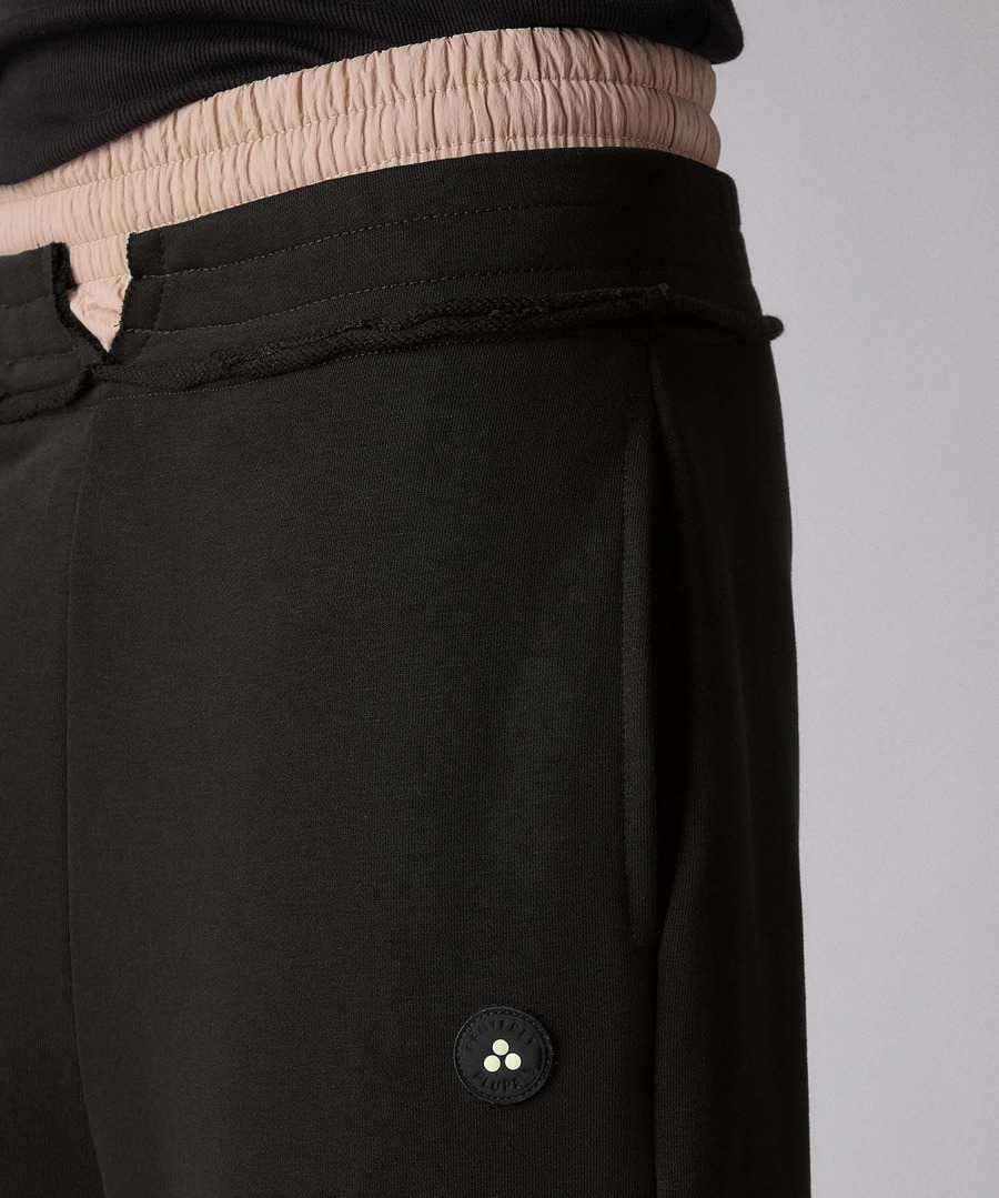 Jogger in 100% cotone con effetto doppio pantalone: la fascia superiore con elastico in tessuto a contrasto crea l’illusione di un boxer a vita alta che emerge dal pantalone, richiamando l’estetica da ring. Il fit rilassato e la costruzione in felpa e le cuciture a vista lo rendono ideale per un look street contemporaneo. Parte della capsule Peuterey Plurals x Tony Effe, questo modello nasce dall’incontro tra lo stile tecnico e metropolitano di Peuterey e l’identità urban di Tony Effe, icona della trap e della moda italiana. La collaborazione fonde moda e musica in una visione creativa condivisa, dove l’attitudine sportiva del brand si intreccia con la passione dell’artista per la boxe e l’estetica streetwear. Il risultato? Un capo bold, d’impatto, che racconta una nuova energia.