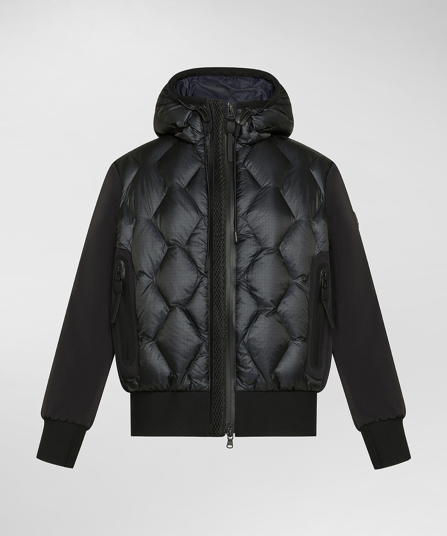 Bomber composto da due materiali tecnici: nylon ripstop 7den, superleggero e lucido e una tela di nylon stretch accoppiata con un jersey di nylon soffice e caldo, che garantisce appeal tecnico e una vestibilità ultra confortevole. Il design originale mostra un fronte capo con trapunta geometrica a rombi mentre maniche e retro sono lisce. Polsini e fondo in maglina nera elastica. Ne deriva un capo altamente di tendenza, adatto a chi non ama passare inosservato. I dettagli stilistici ed estetici confermano l’anima urban di questo capospalla che si caratterizza per: full zip centrale con doppio cursore, cappuccio fisso regolabile, imbottitura in piuma naturale certificata, due ampie tasche laterali con zip termosaldate. Downproof e idrorepellente. Un capo tecnico e originale per vestire di comfort e stile questa stagione fredda.