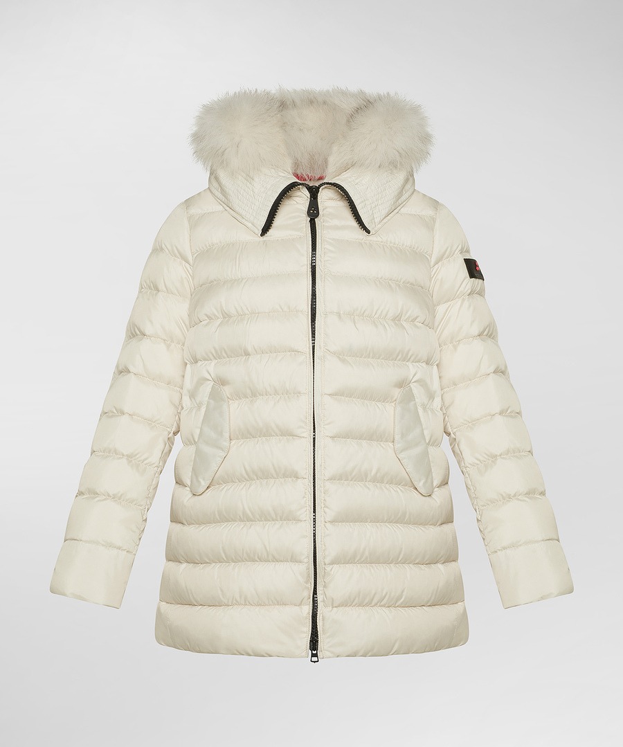 Cappuccio fisso con pelliccia di volpeIn poliestere riciclato post consumoImbottitura in piuma naturale certificataLunghezza: lungoFull zip centrale