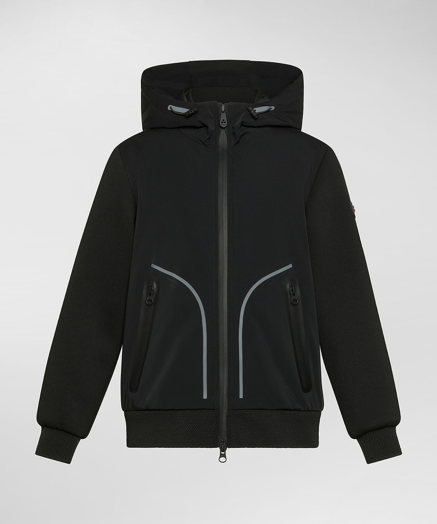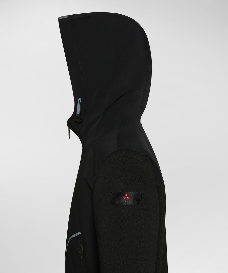 In scuba di poliestere elasticizzato e maglina di viscosaIn nylon bi-stretch e jerseyCapo hybridCappuccio fisso regolabileProfili catarinfrangenti