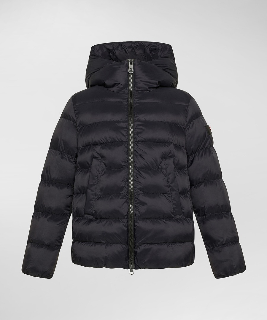 In nylon riciclato superleggero 20 denImbottitura in sintetico riciclatoCappuccio fissoDown proofTrattamento idrorepellente PFC freeFull zip centrale nera in contrasto colore