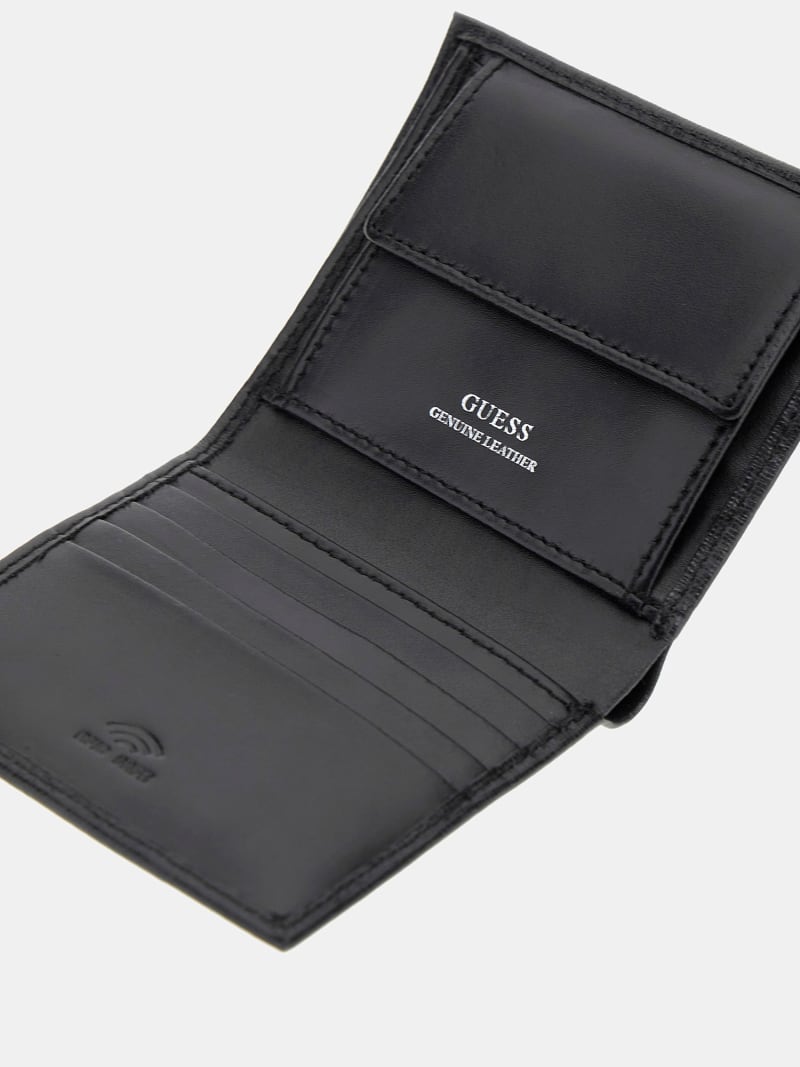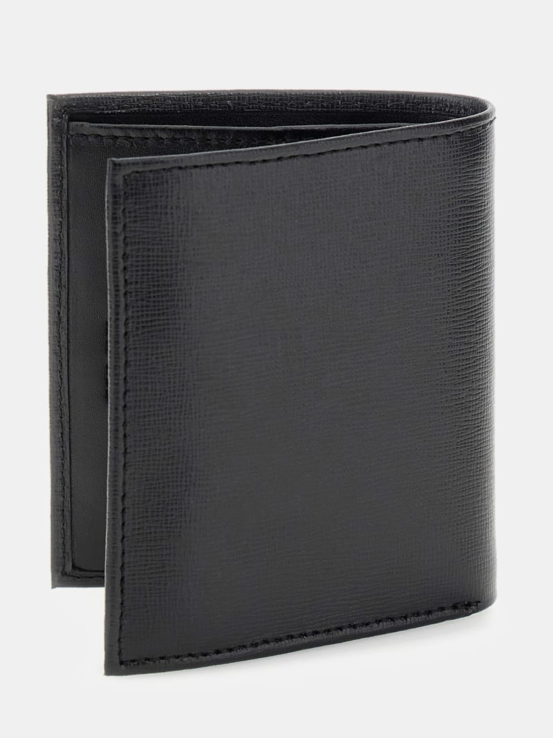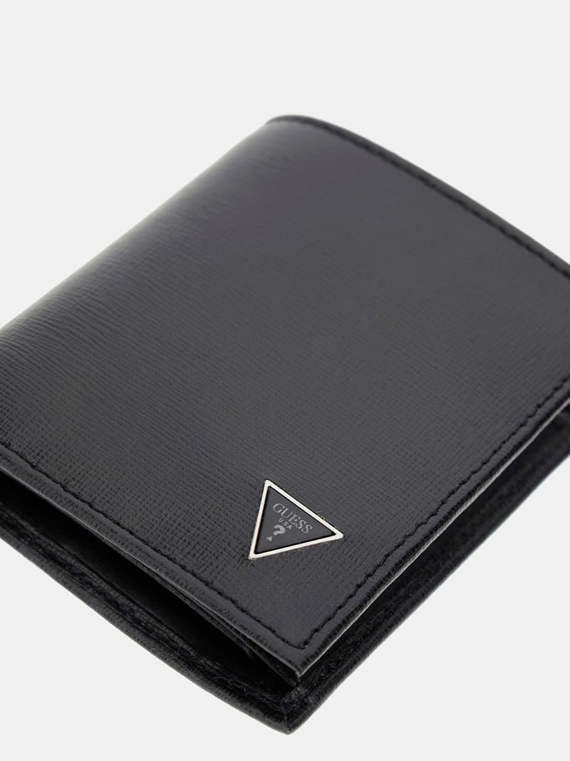 Rivestimento esterno in vera pelle.Motivo Saffiano.Hardware color argento.Portamonete all'interno.Logo triangolare in metallo sul davanti.