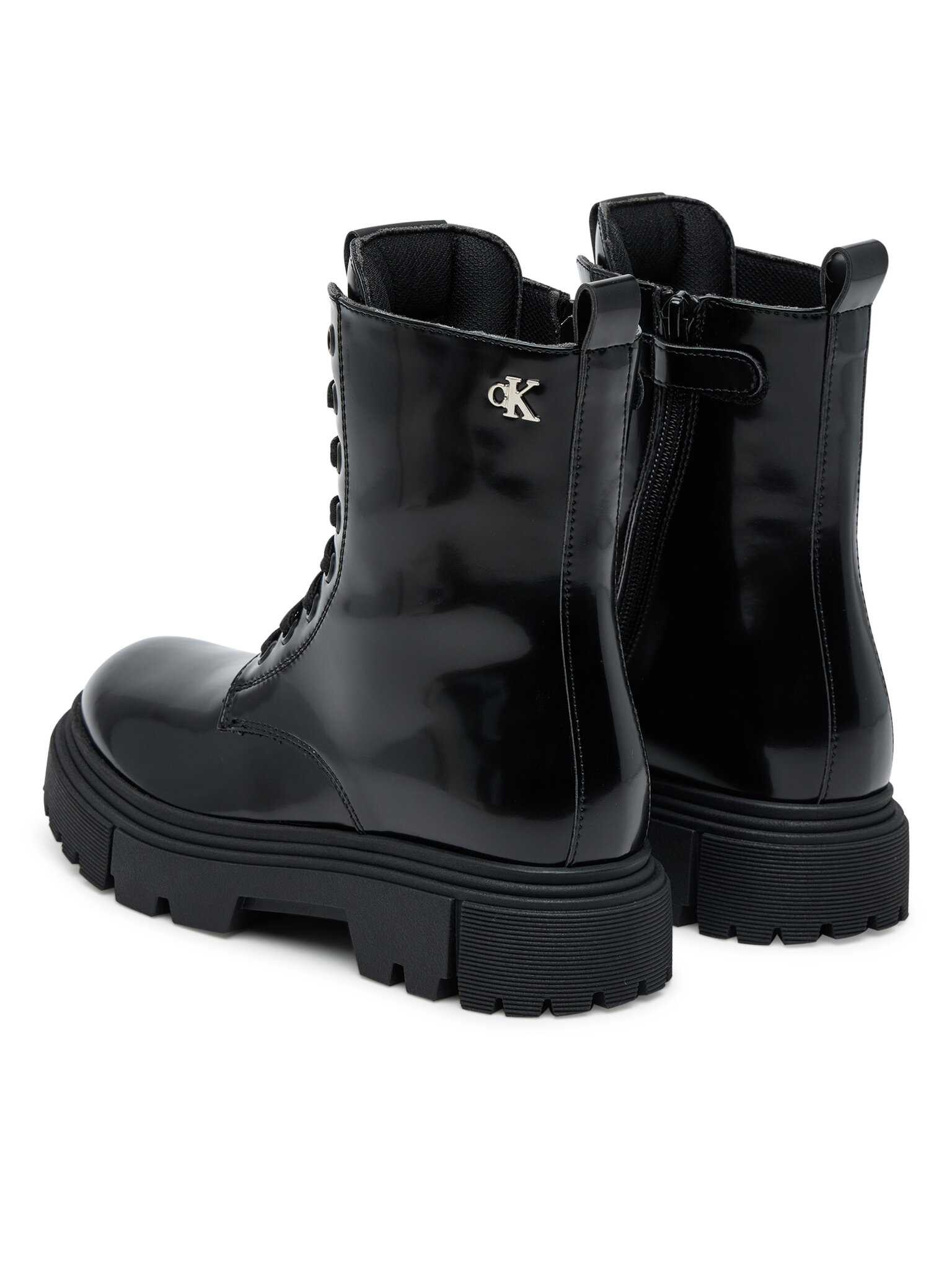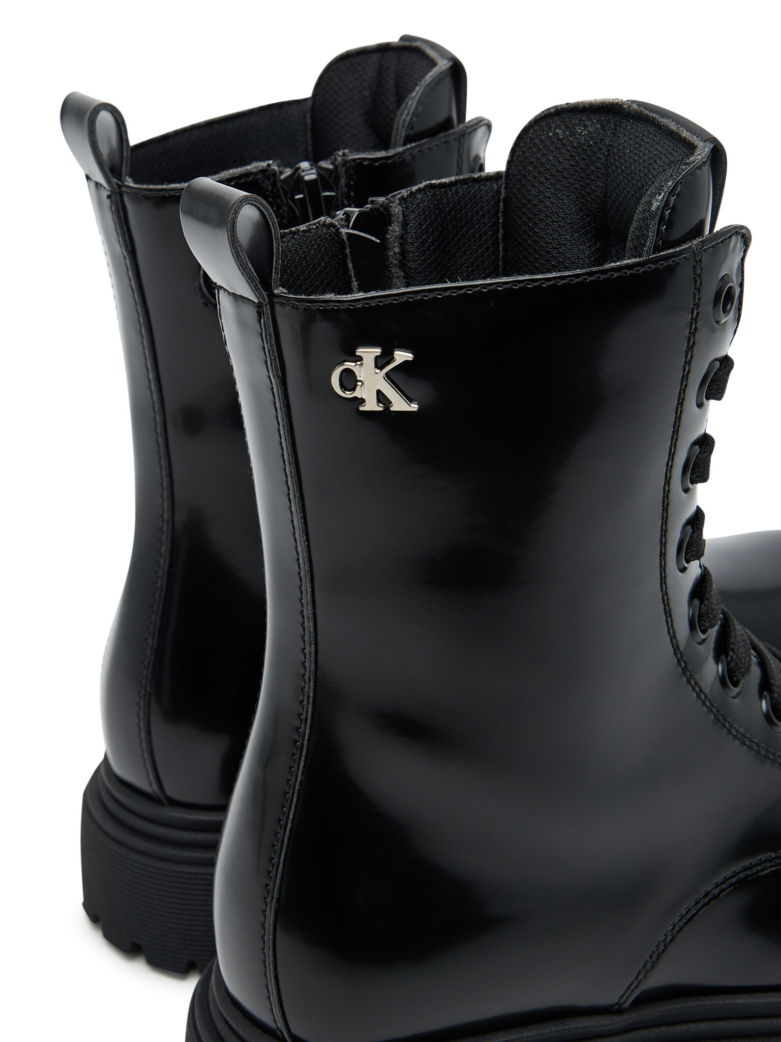 * Anfibio in finitura lucida.* Chiusura con lacci.* Suola carrarmato.* Passante sul tallone.* Placca logo monogramma CK sulla caviglia.