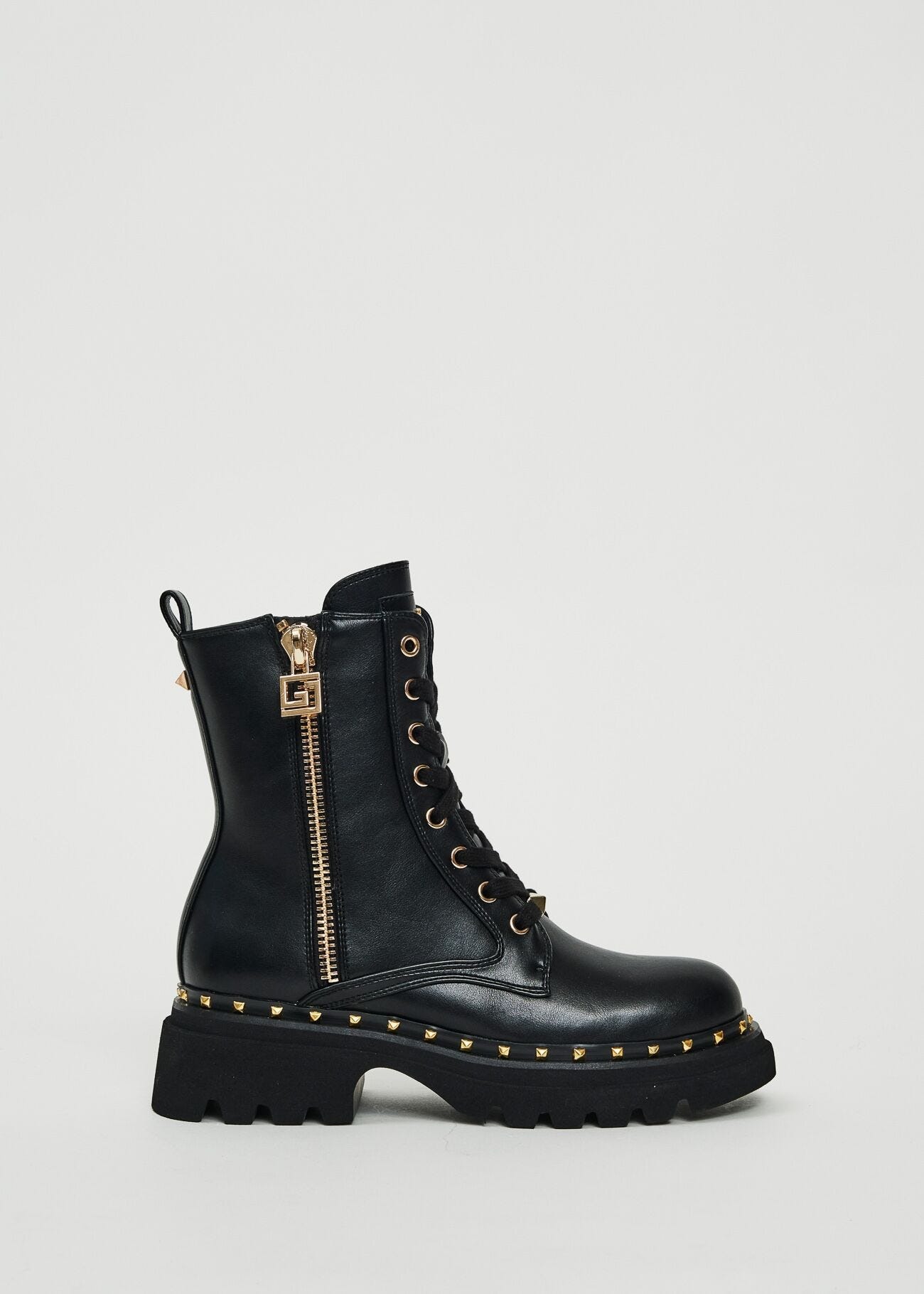 Tronchetto allacciato in morbida similpelle con zip ornamentale in metallo con tirante personalizzato. Chiusura con lacci e zip interna.