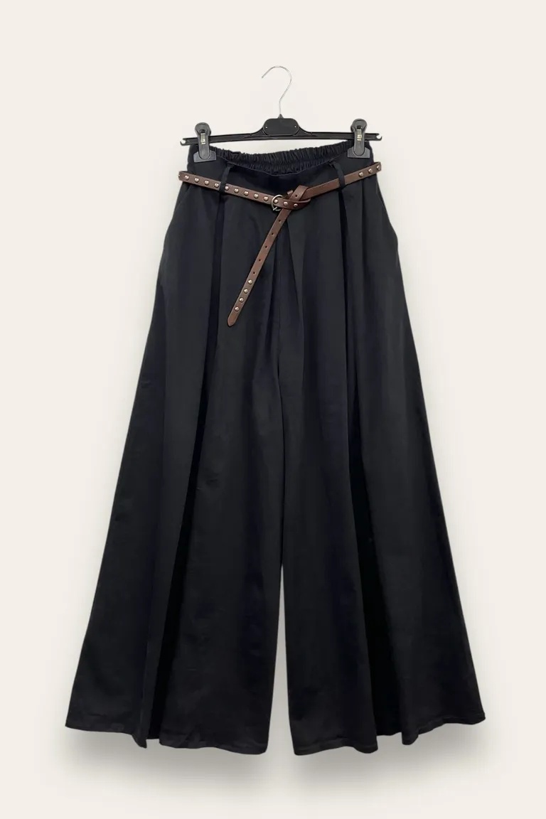 * Pantaloni a gamba ampia* Vita con elastico posteriore* Passanti per cintura* Cintura sottile in pelle con borchie inclusa* Tasche laterali