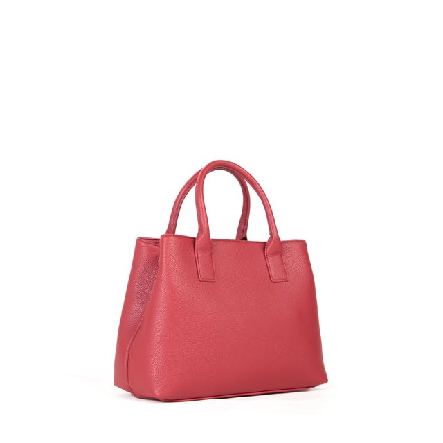 Shopping a mano, in grana, di medie dimensioni, con logo in metallo e tracolla in nastro staccabile e regolabile.