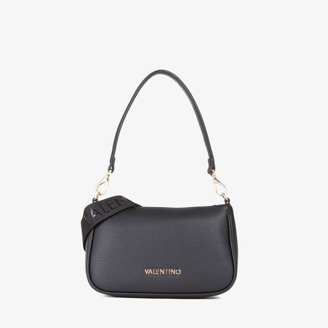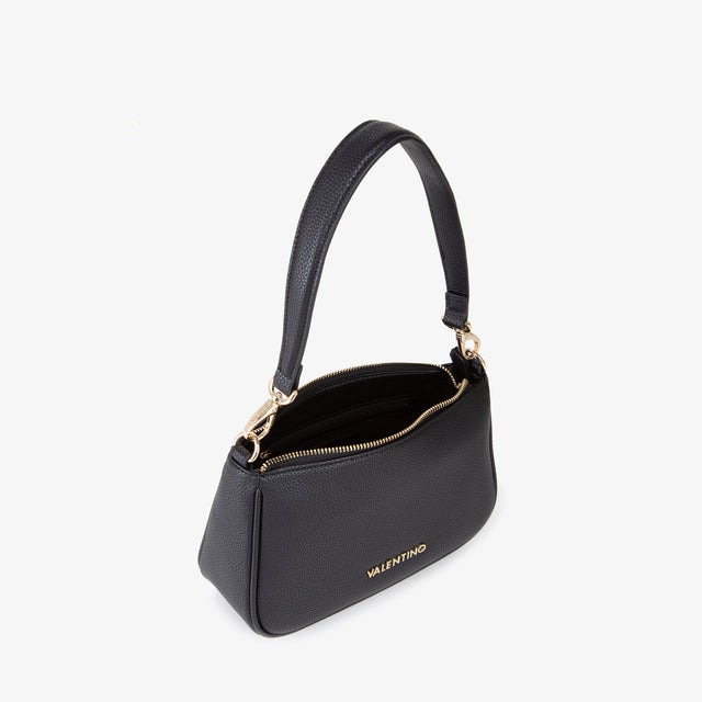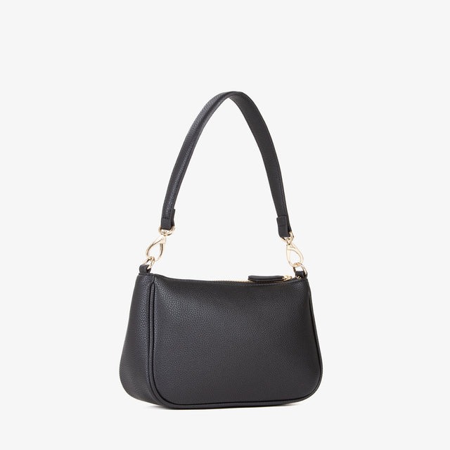 Sottospalla in grana, di piccole dimensioni, con logo in metallo e tracolla in nastro staccabile e regolabile.