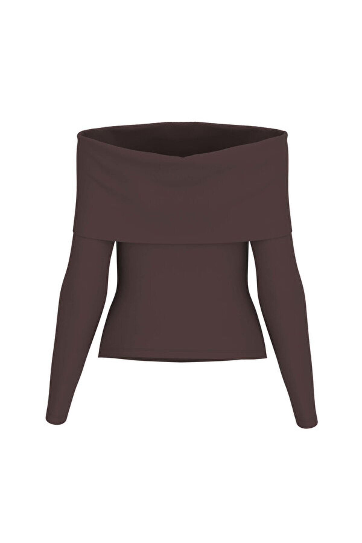 Top.Marrone.Maniche lunghe.Scollo a barca.Taglio aderente.Senza stampe o decorazioni.
