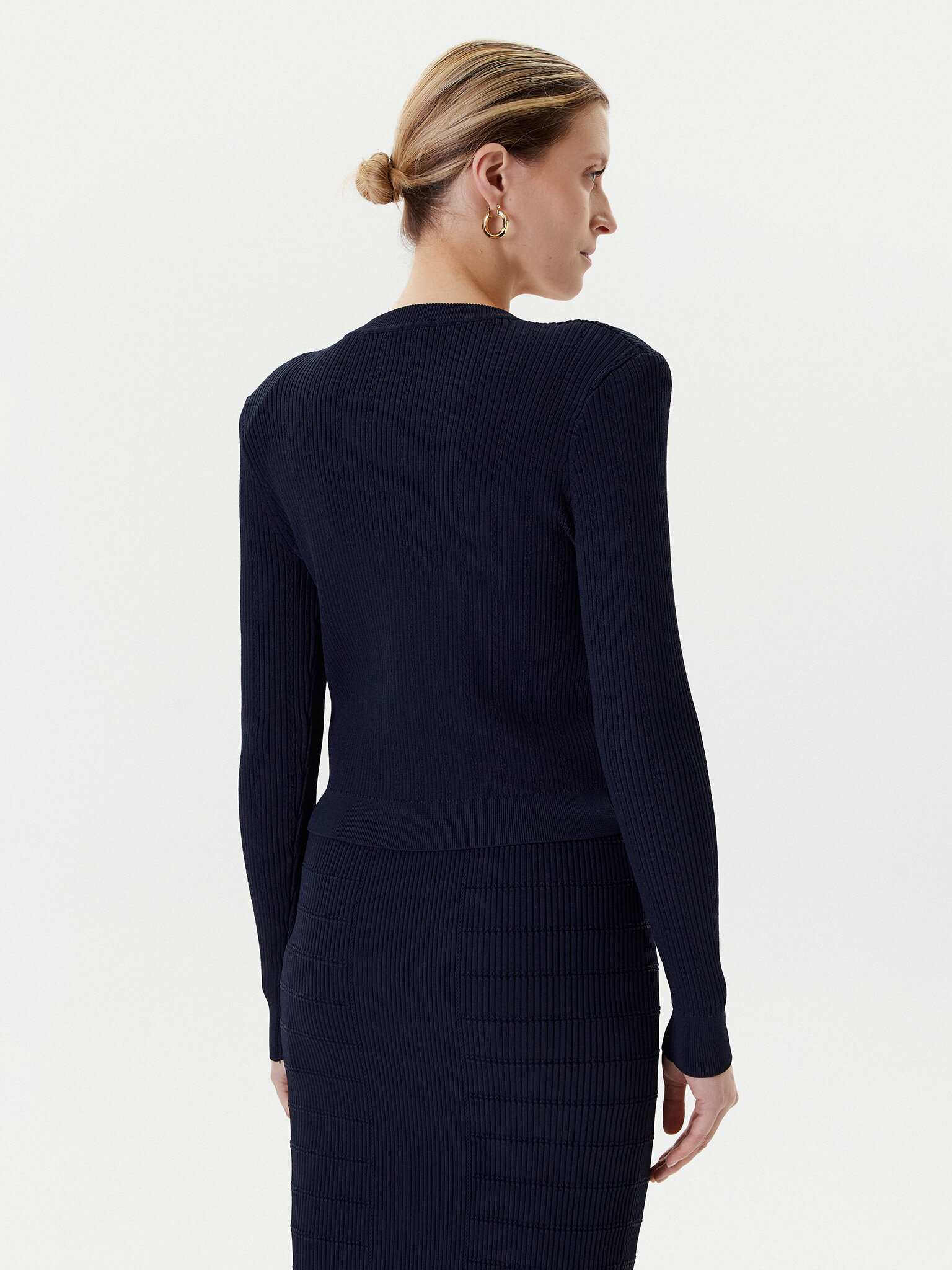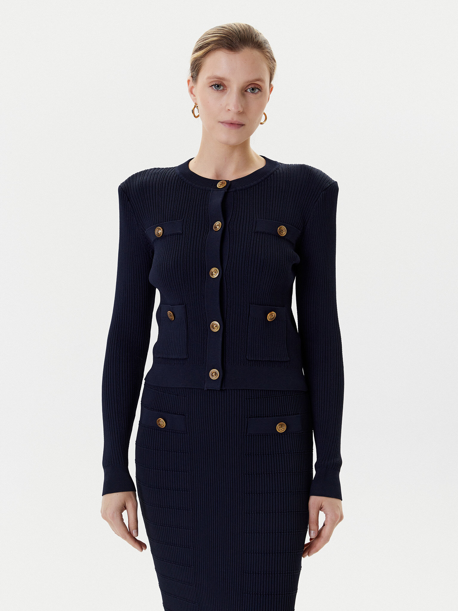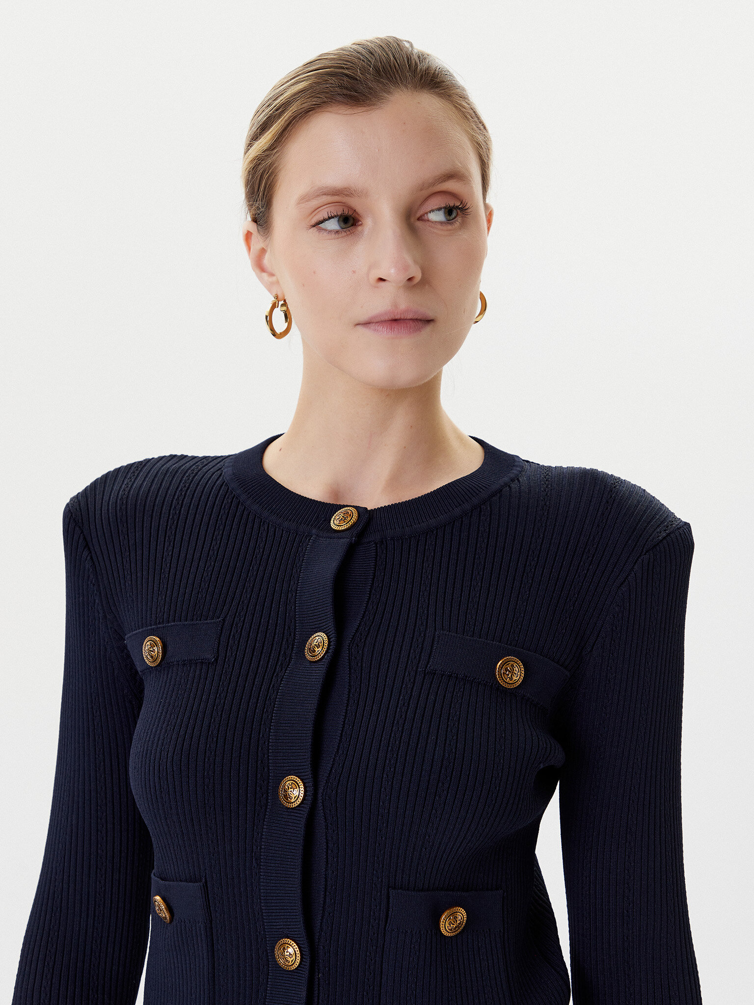 Cardigan in misto viscosa.Scollo rotondo e manica lunga.Costine verticali all over.Tasche frontali applicate con bottone e tasche decorative con bottone sul petto.Chiusura con bottoni.
