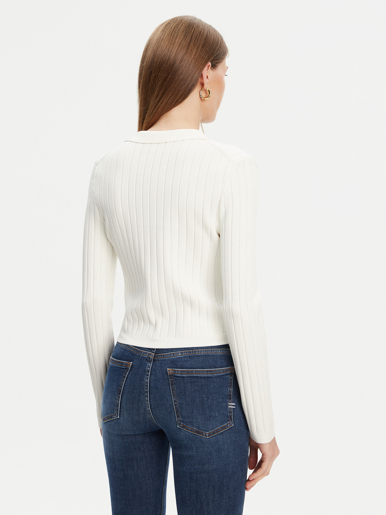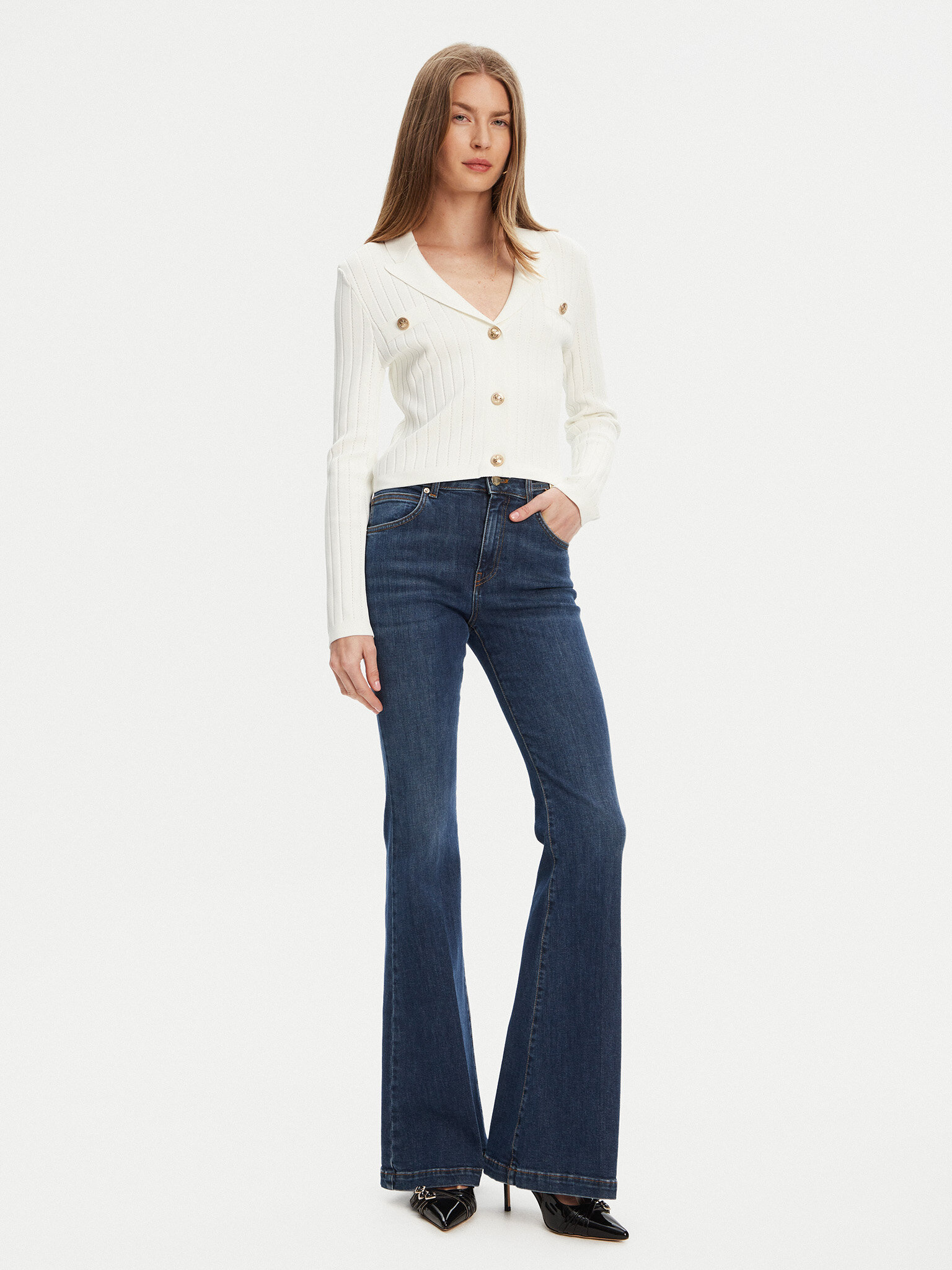 Cardigan a maniche lungheTessuto a costineScollo a V con collettoChiusura frontale con bottoni goffratiTaschino decorativo sul pettoVestibilità aderente