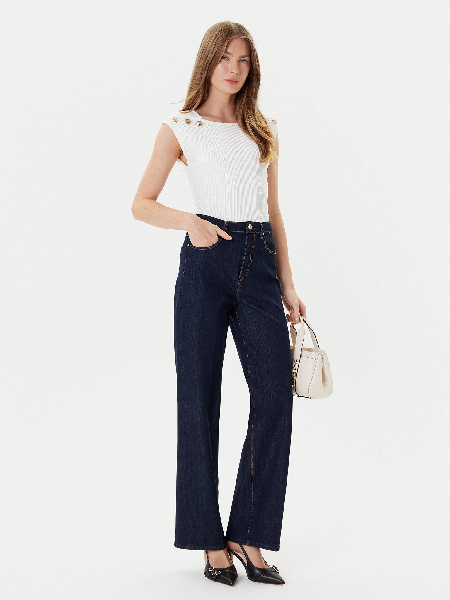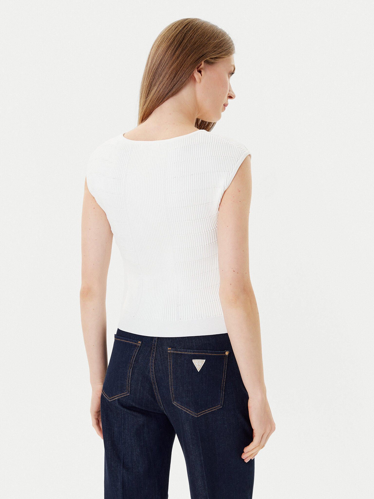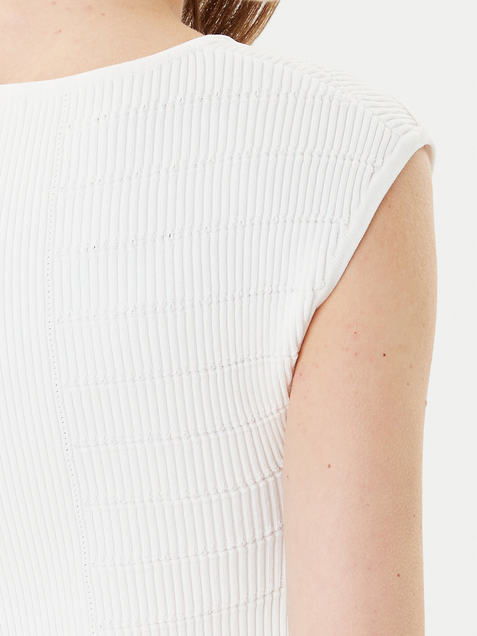 Top in maglia di misto viscosa stretch.Scollo rotondo profondo.Maniche ad aletta con bottoni decorativi sul davanti.Costine verticali all over.Chiusura con bottoni.