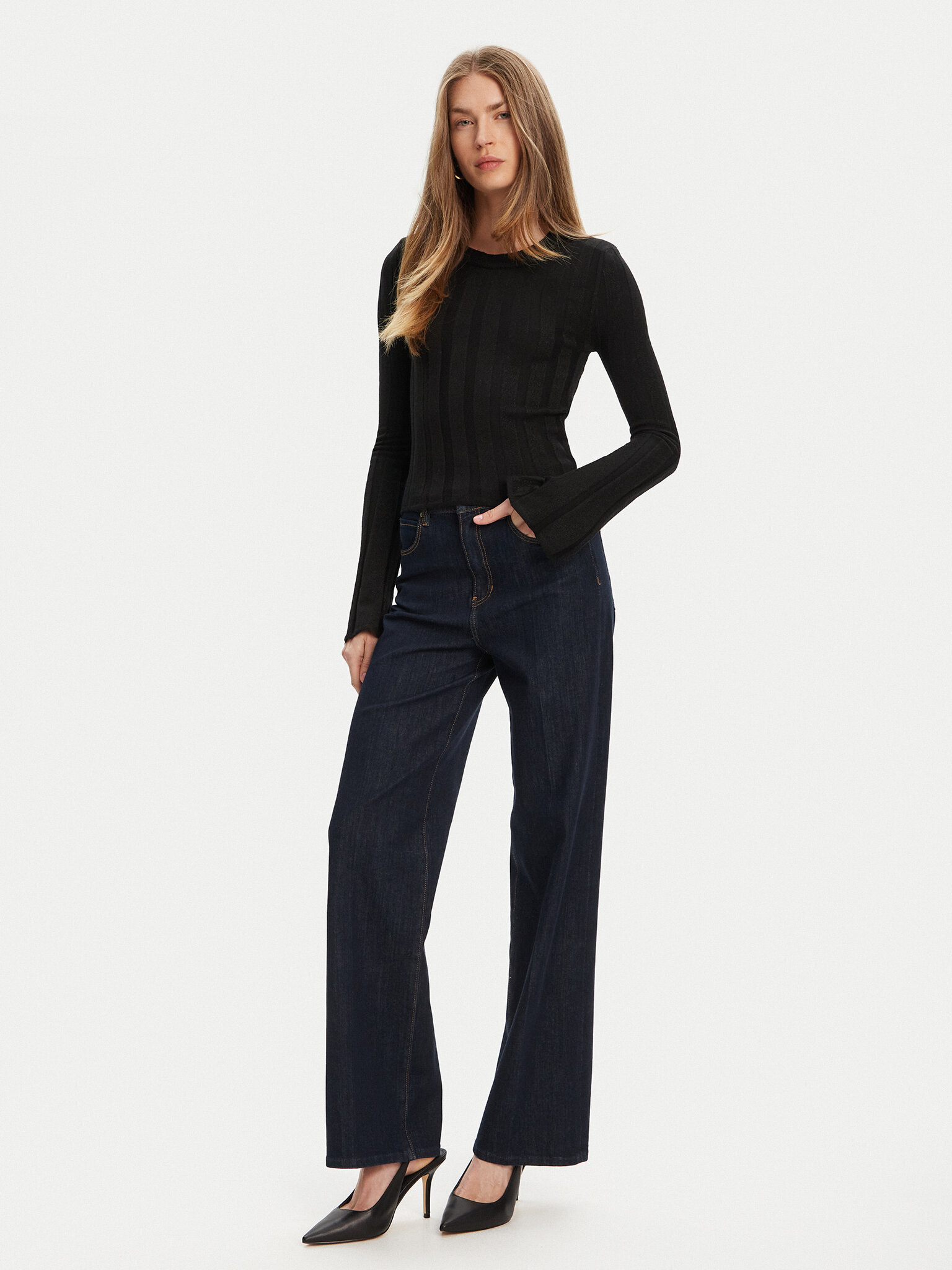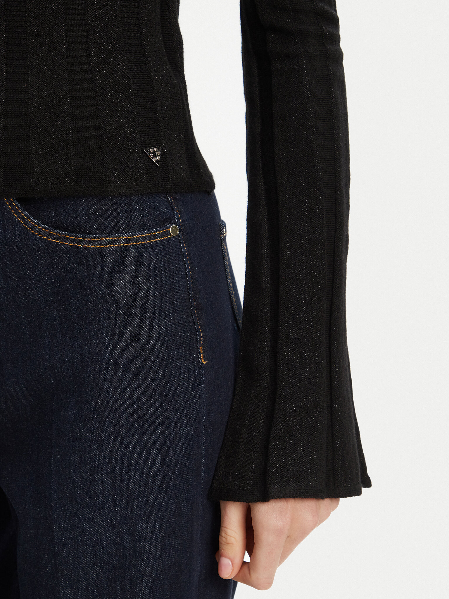 Maglia a maniche lungheLavorazione a costineScollo rotondoManiche svasate sul fondoVestibilità aderentePlacchetta con logo applicata sul davanti