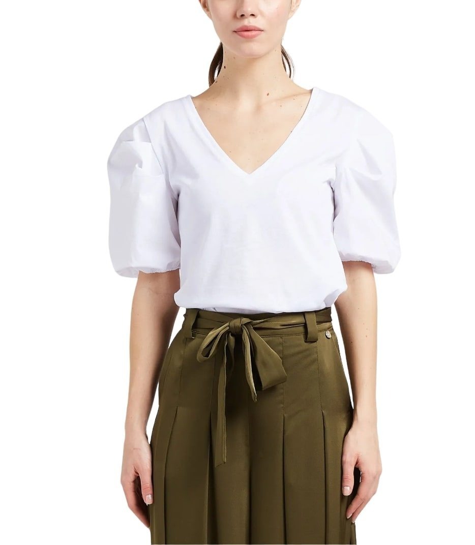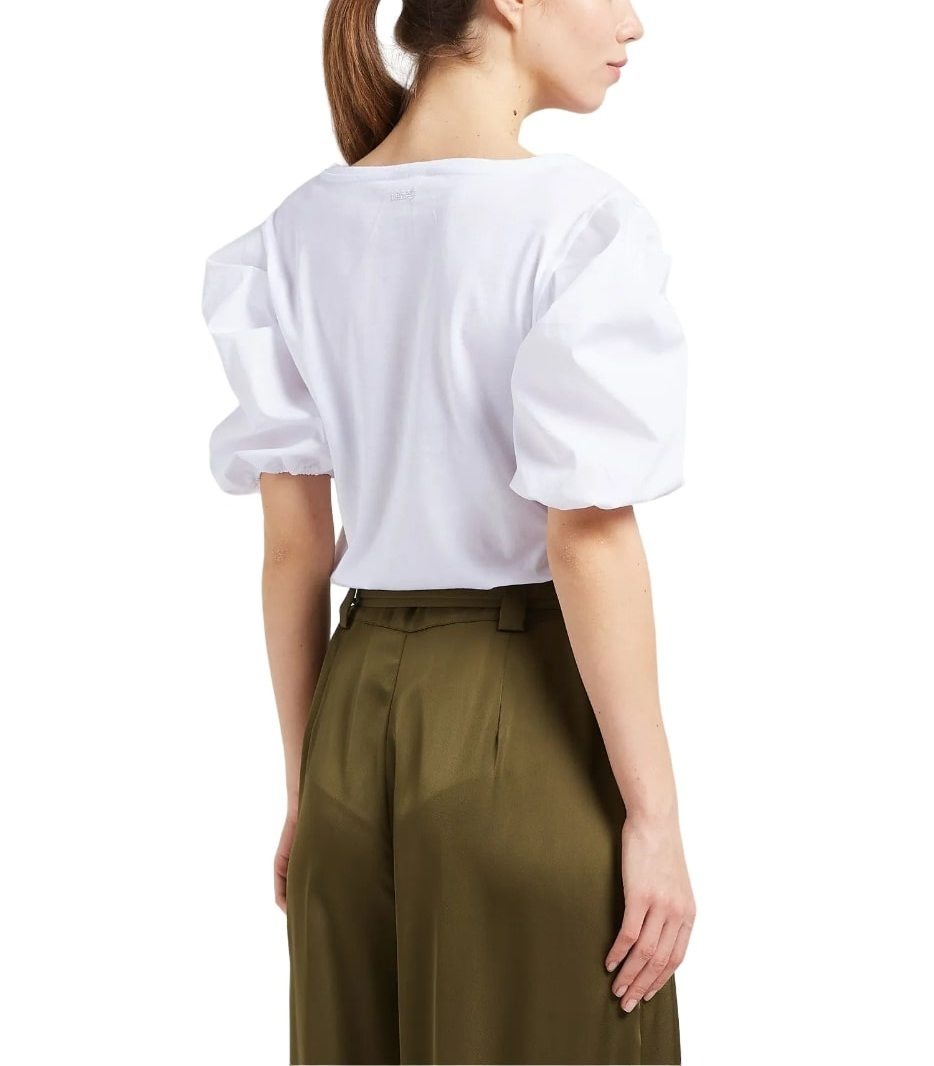 T-shirt in jersey di cotoneManiche in popeline di cotoneScollo a VManiche a tre quarti a palloncinoLogo con strass sul retroMade in Italy