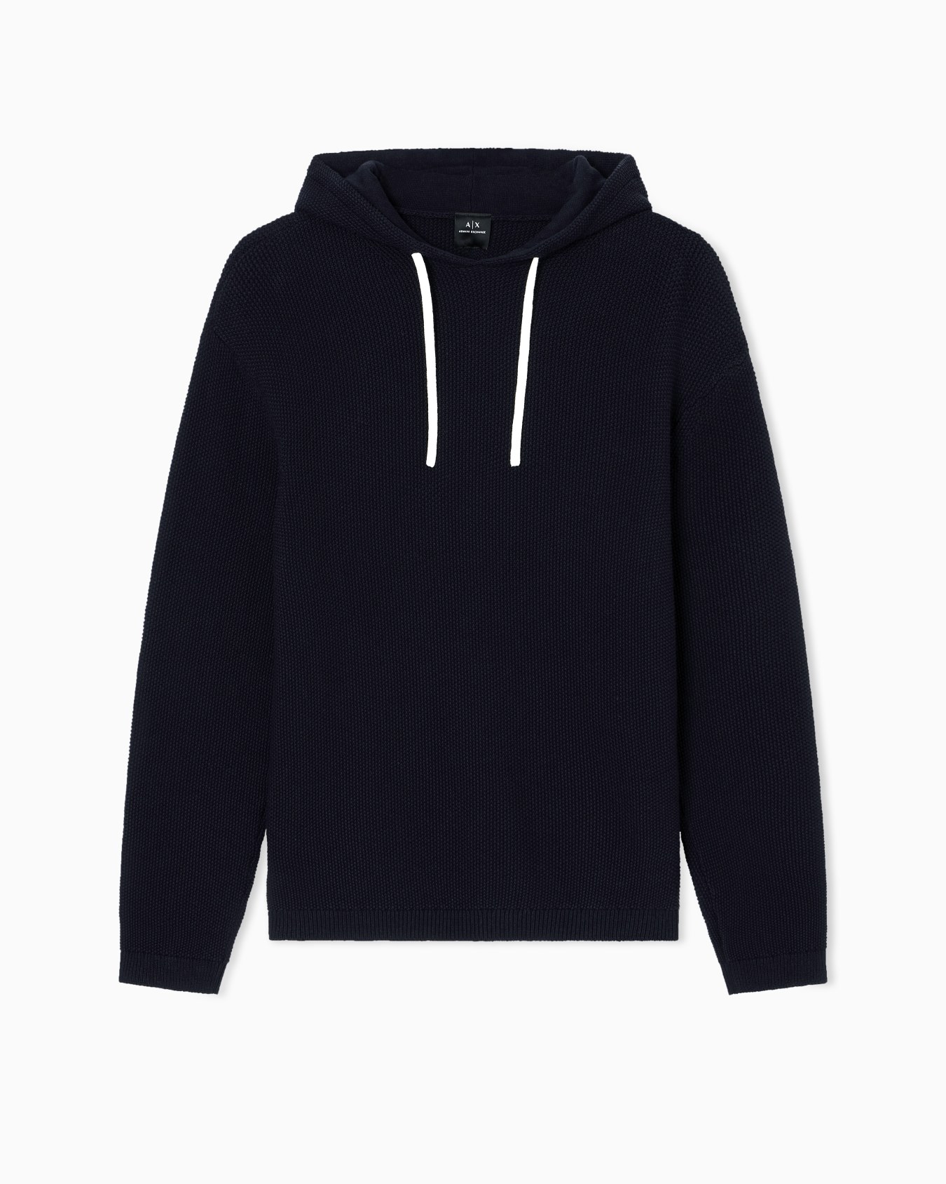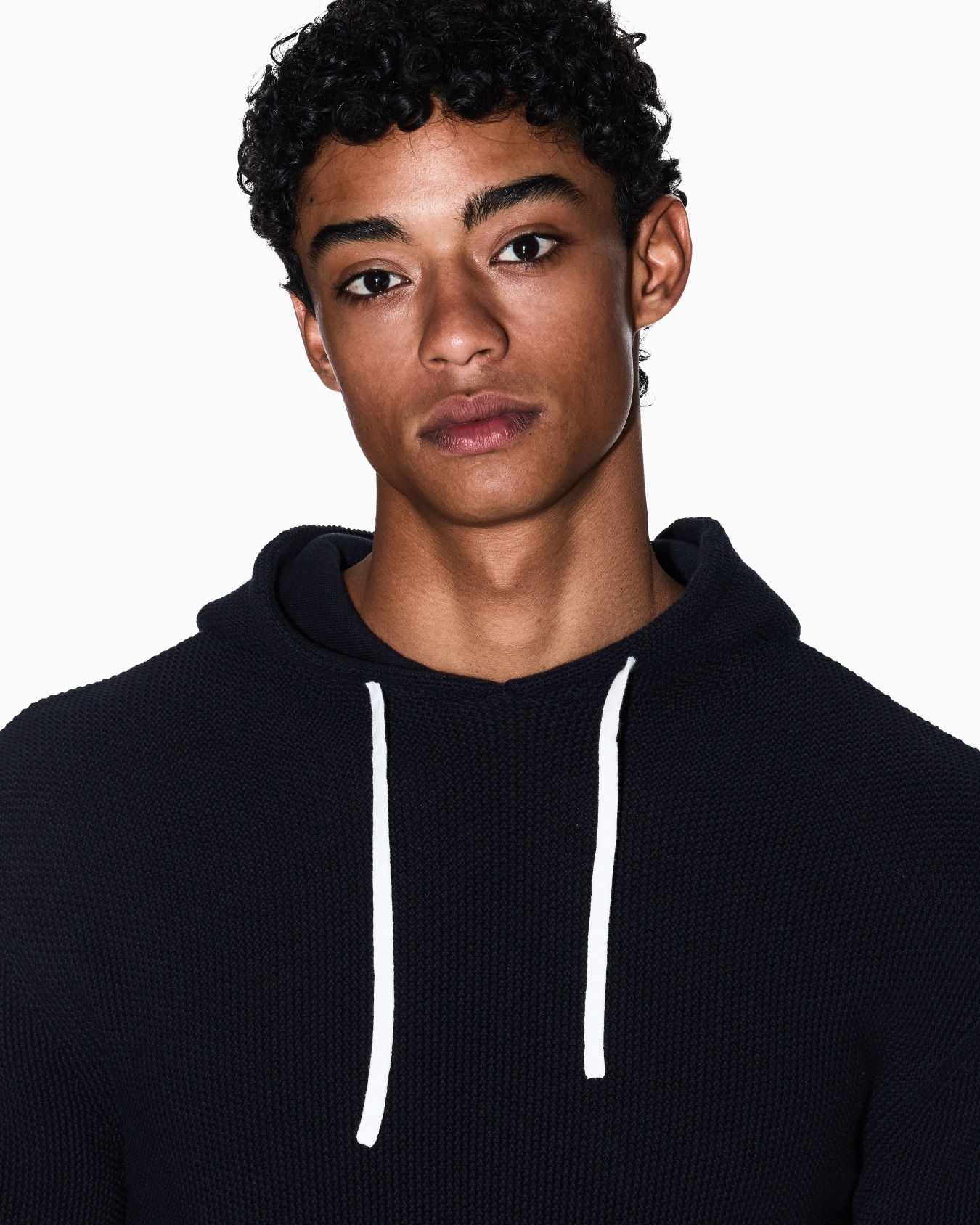 Maglione con cappuccio in cotone lavorato a maglia con punto riso, che gli conferisce una texture tridimensionale e un fascino super contemporaneo. Questo capo ibrido tra un maglione e una felpa è ideale per chi cerca comfort e stile senza compromessi. Il cappuccio con coulisse a contrasto aggiunge un dettaglio urbano e funzionale, mentre la silhouette rilassata lo rende perfetto per ogni momento della giornata.