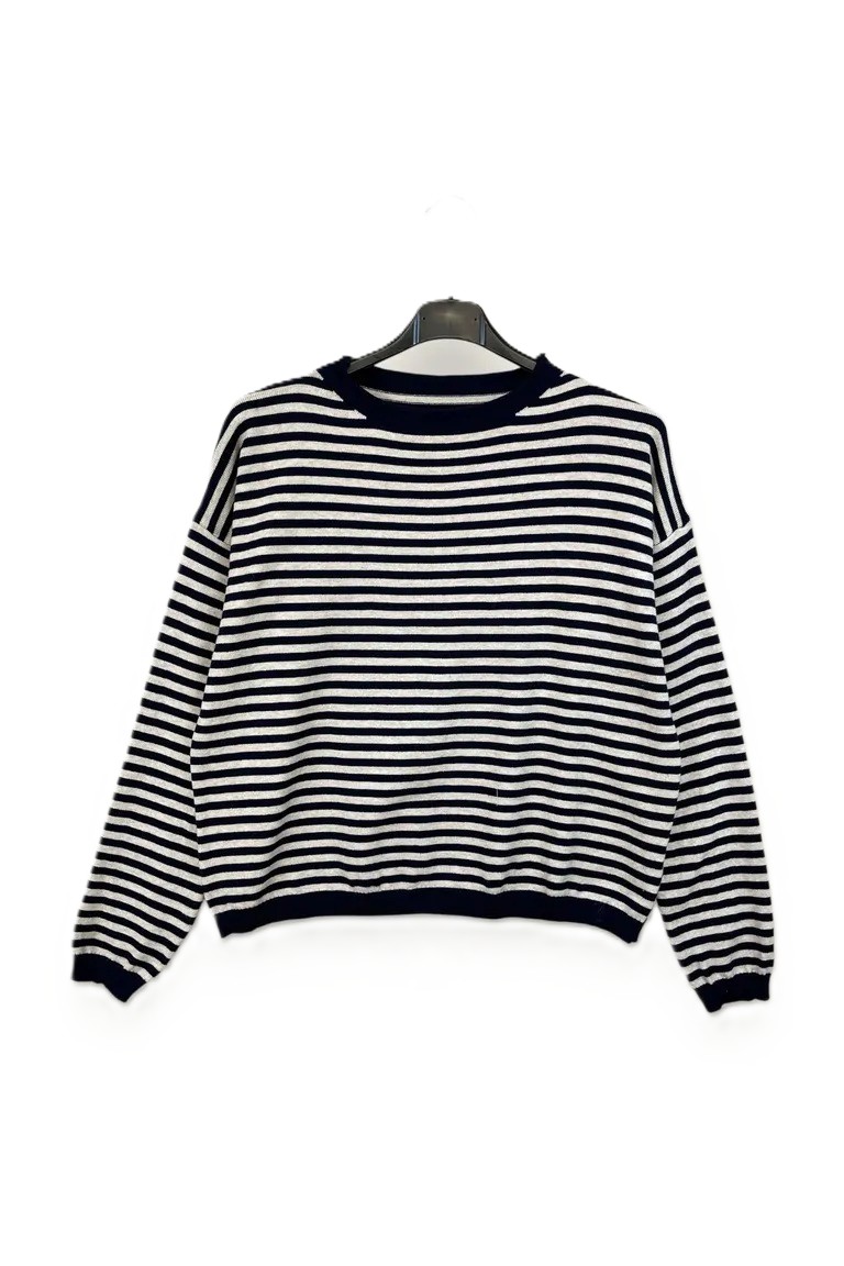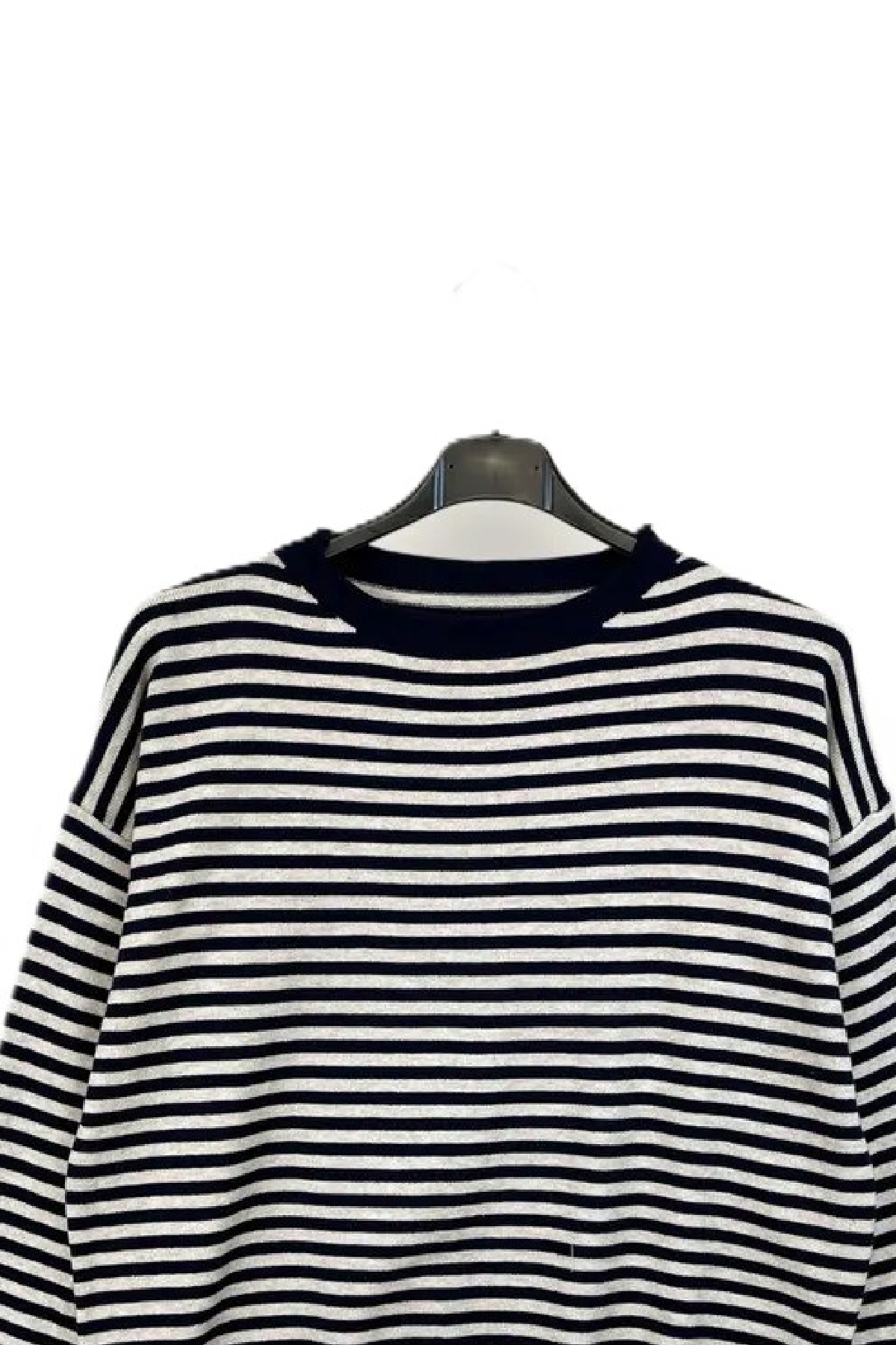* Maglia in maglia leggera a righe orizzontali* Scollo rotondo e maniche lunghe* Fondo e polsini con bordi a costine* Vestibilità comoda e lineare