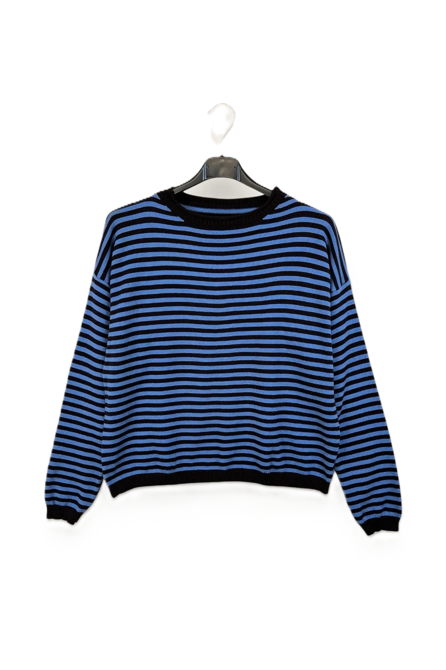 * Maglia in maglia leggera a righe orizzontali* Scollo rotondo e maniche lunghe* Fondo e polsini con bordi a costine* Vestibilità comoda e lineare