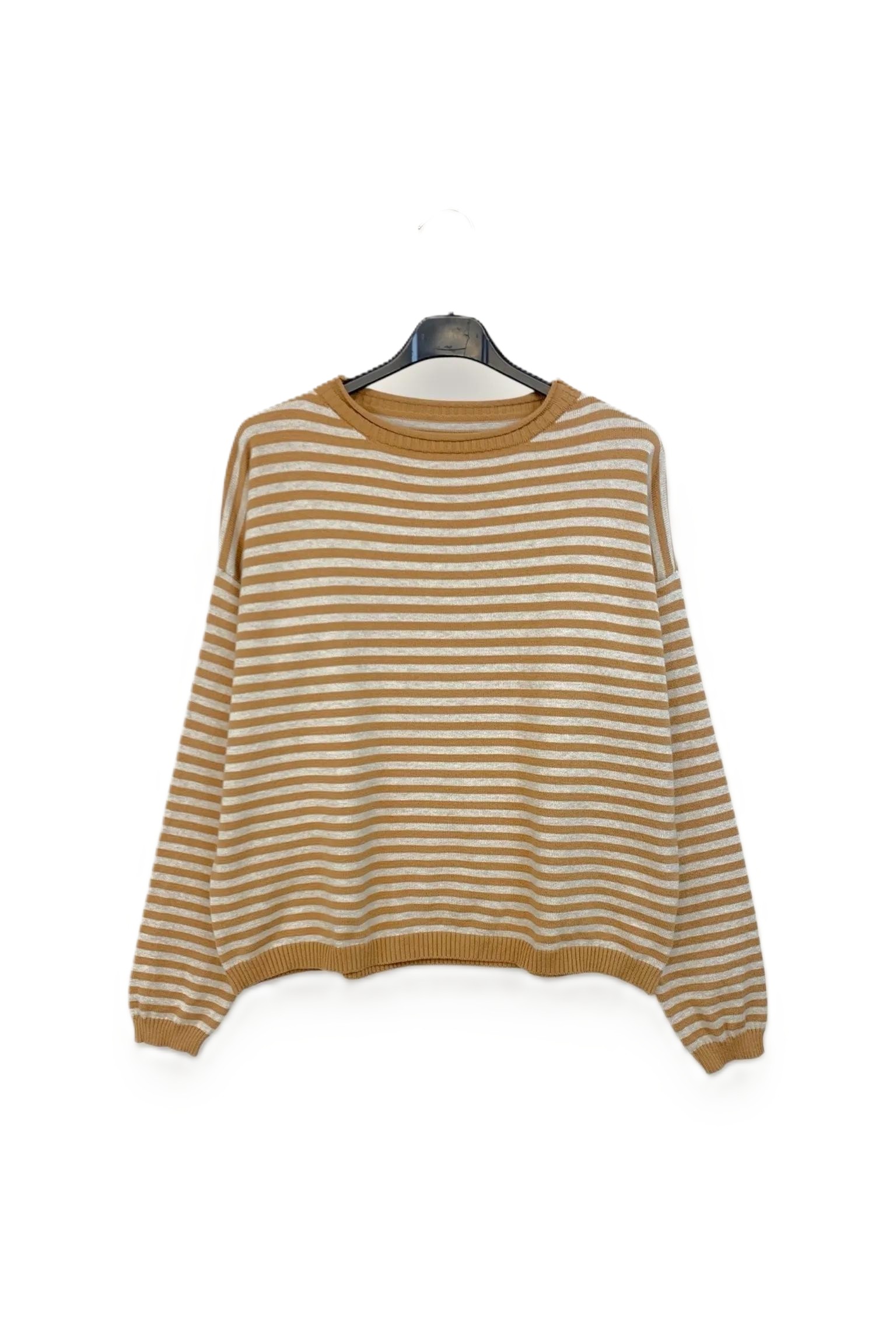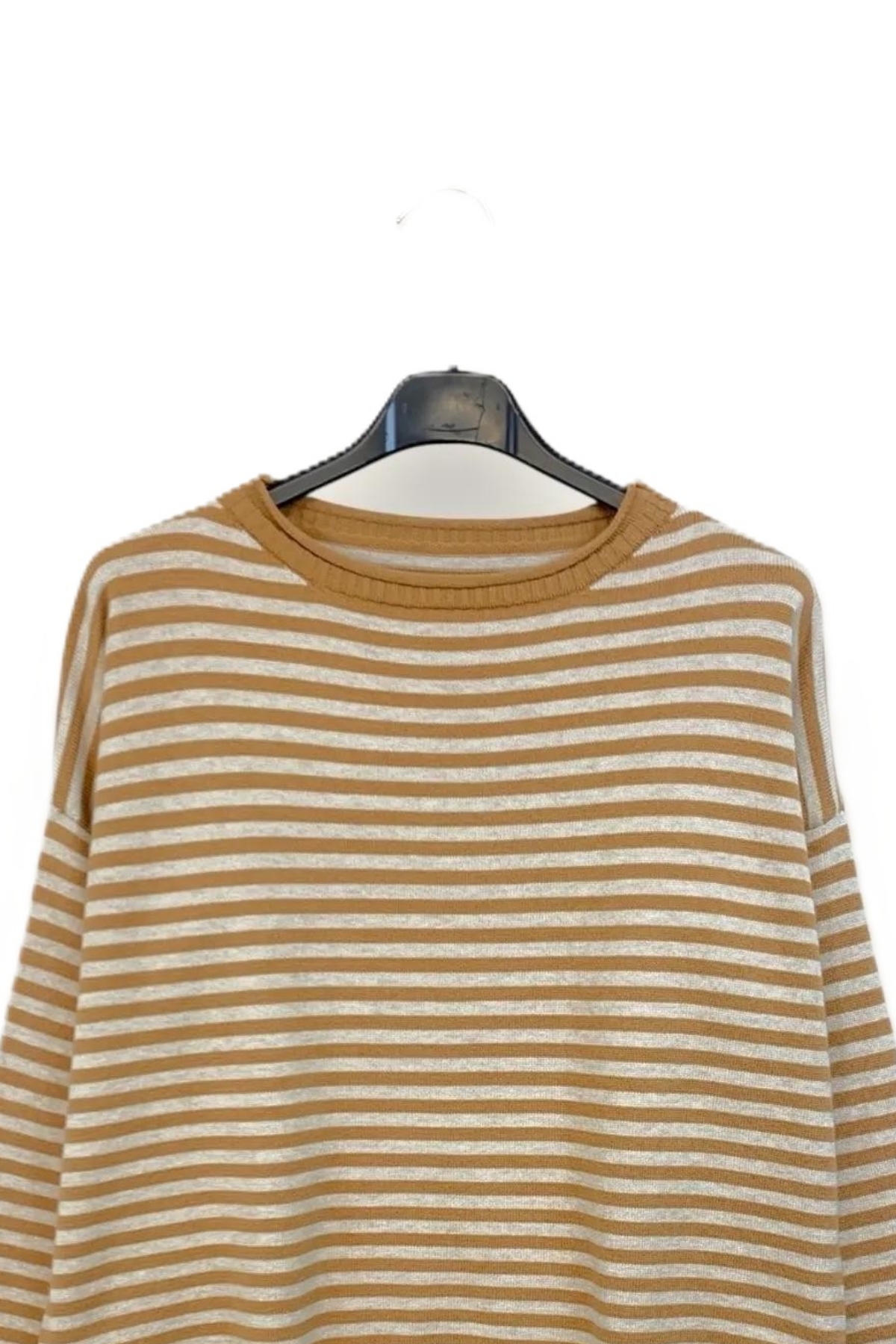 * Maglia in maglia leggera a righe orizzontali* Scollo rotondo e maniche lunghe* Fondo e polsini con bordi a costine* Vestibilità comoda e lineare