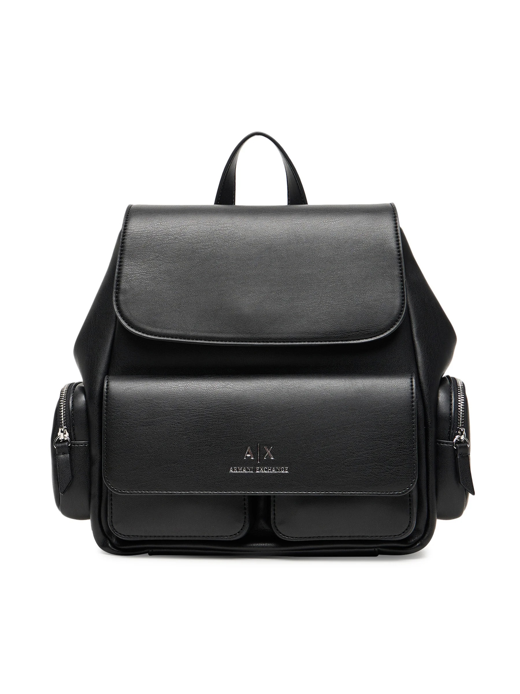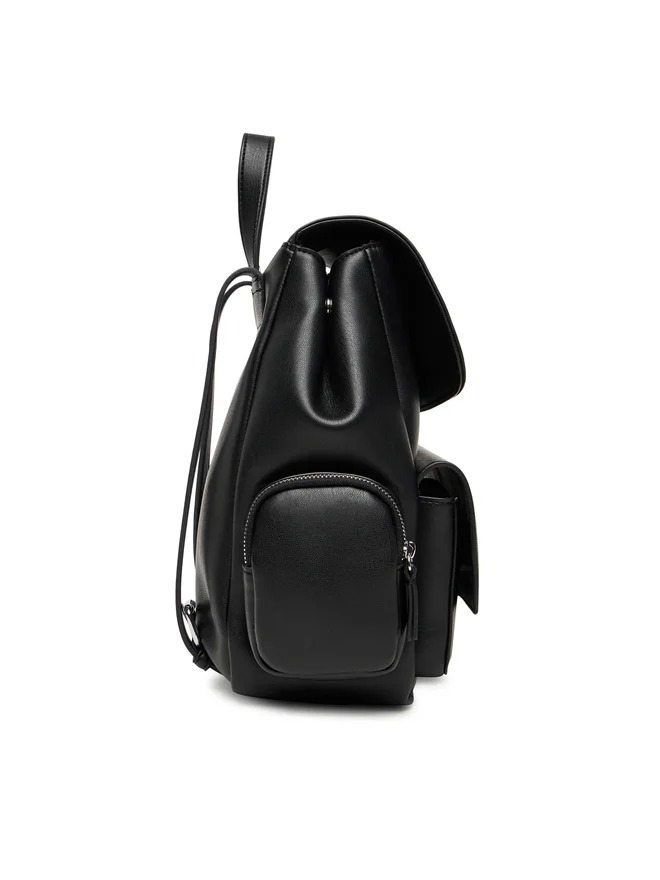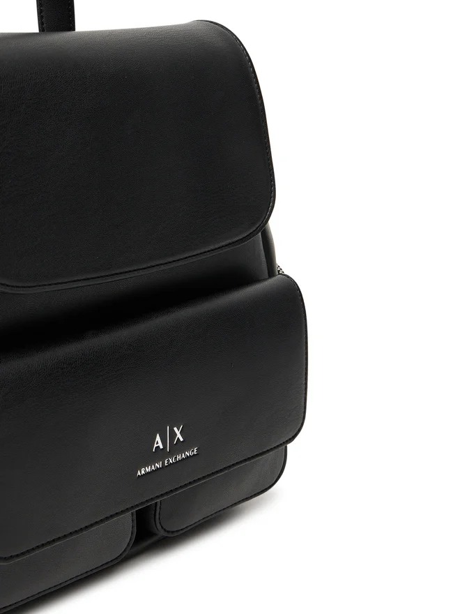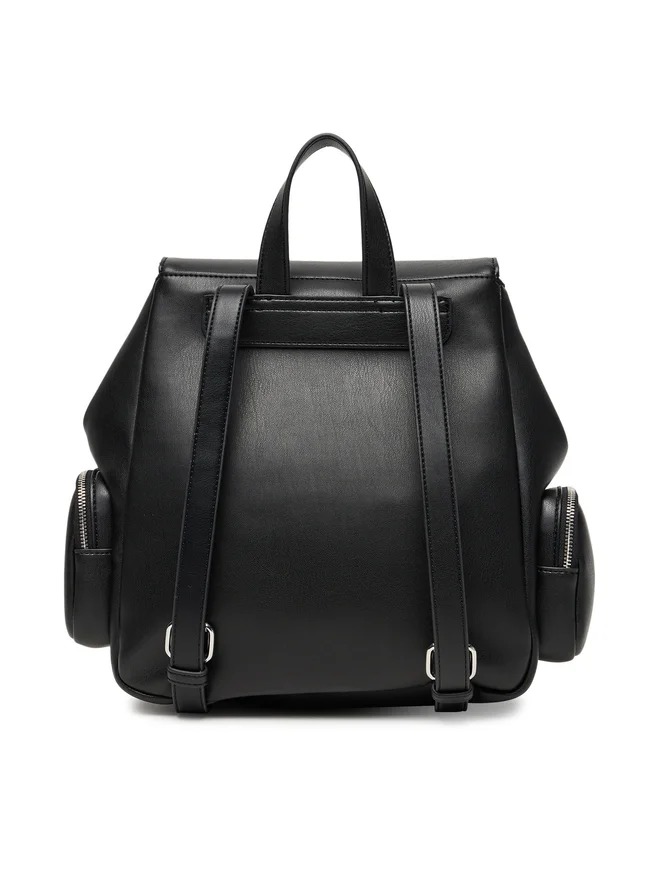 Zaino con patta di chiusura Doppia tasca frontale e due tasche laterali con zip Manico superiore Spallacci regolabili sul retro Logo frontale con lettering Realizzato in materiale texturizzato