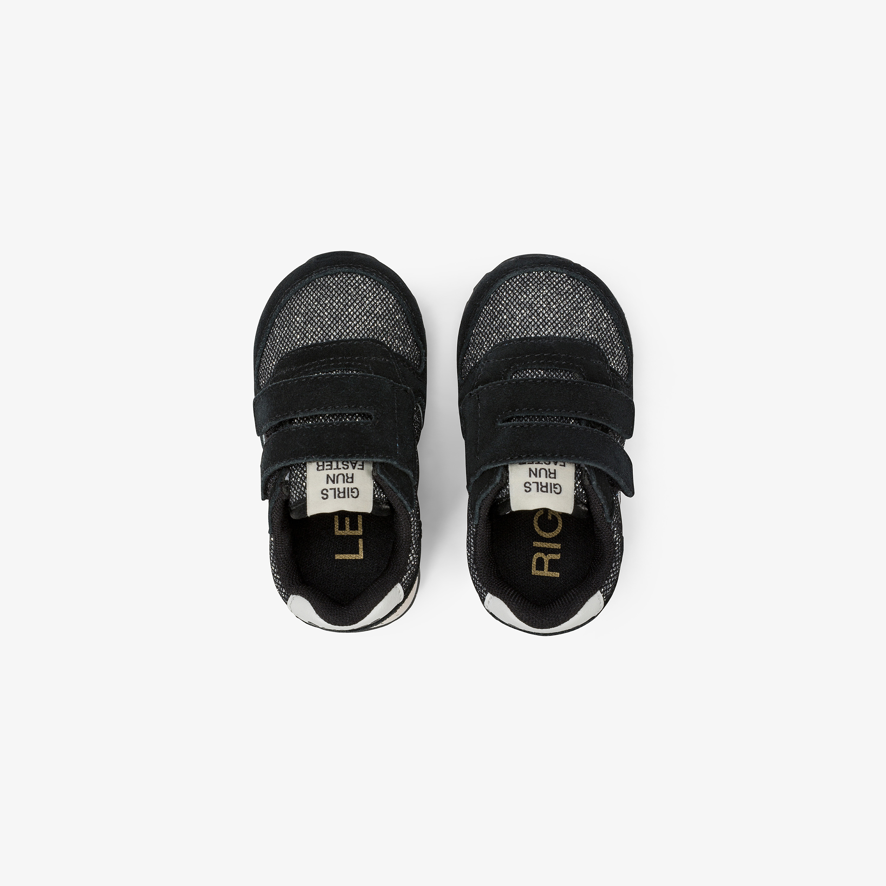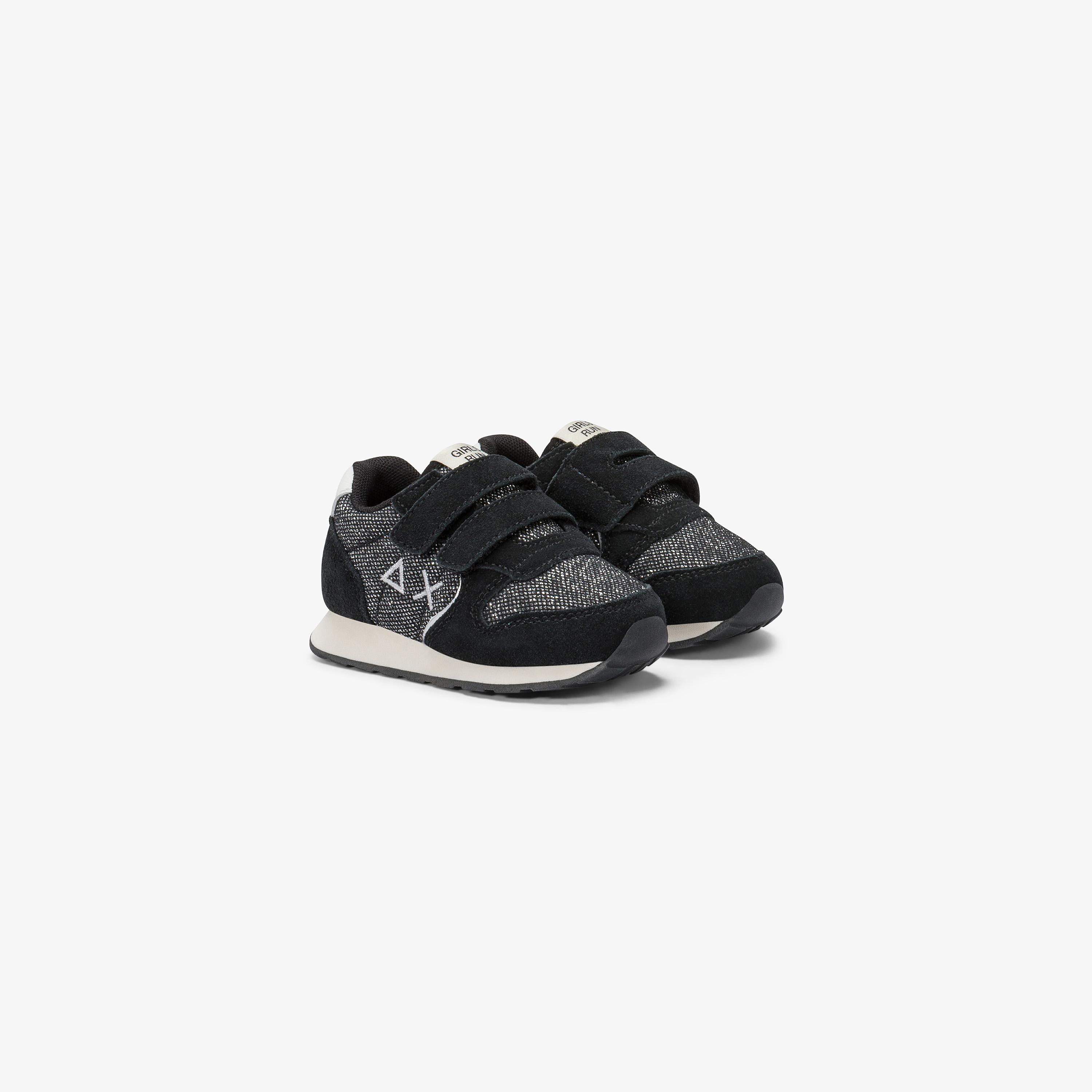 La versione mini me dell'iconica sneaker Ally Glitter è proposta con una speciale tomaia in materiale glitterato, dettagli laminati e il logo ricamato in filo lurex. La chiusura a strappo offre massima versatilità.