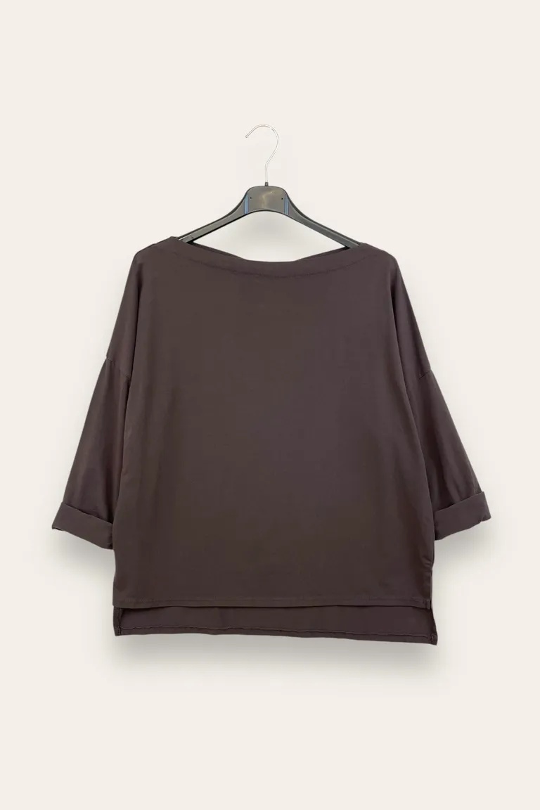 * Maglia a maniche corte con vestibilità morbida* Girocollo ampio* Maniche con risvolto cucito* Fondo leggermente più lungo sul retro* Tessuto leggero e fluido