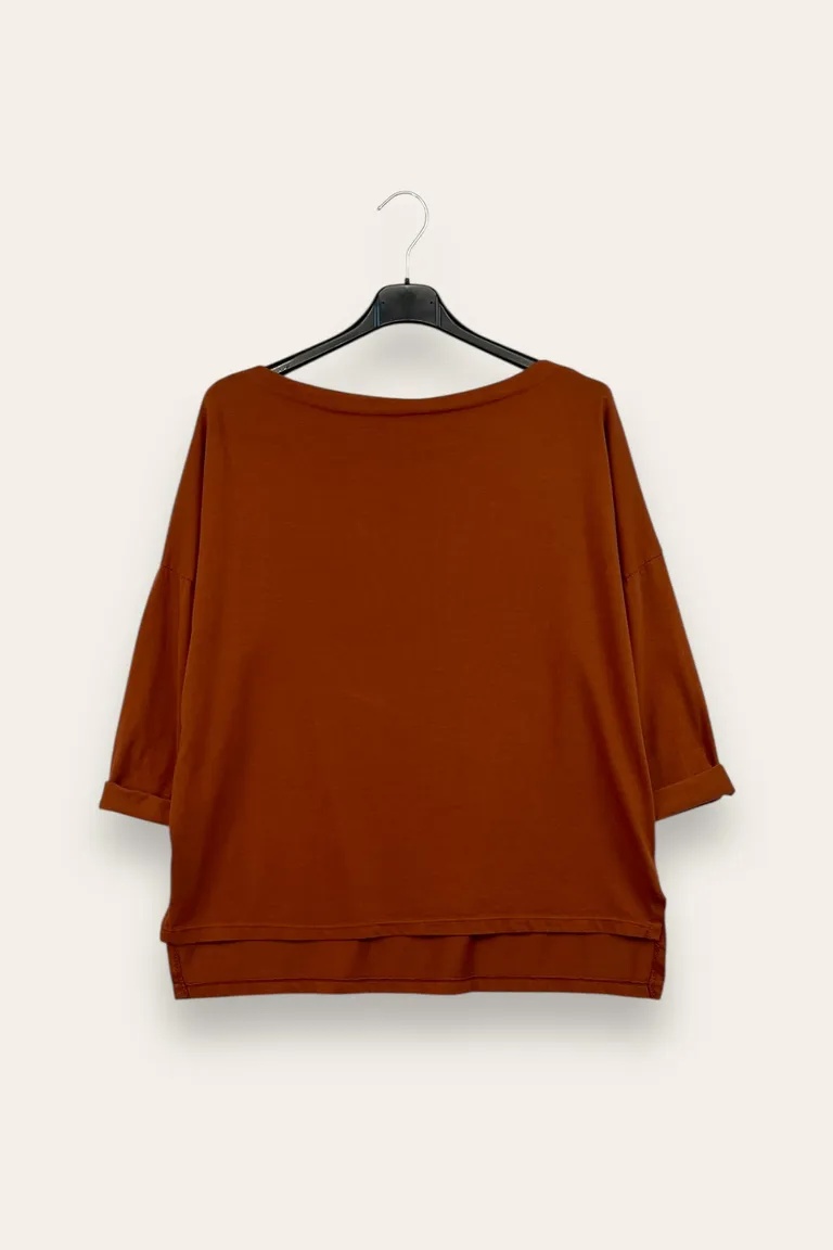 * Maglia a maniche corte con vestibilità morbida* Girocollo ampio* Maniche con risvolto cucito* Fondo leggermente più lungo sul retro* Tessuto leggero e fluido