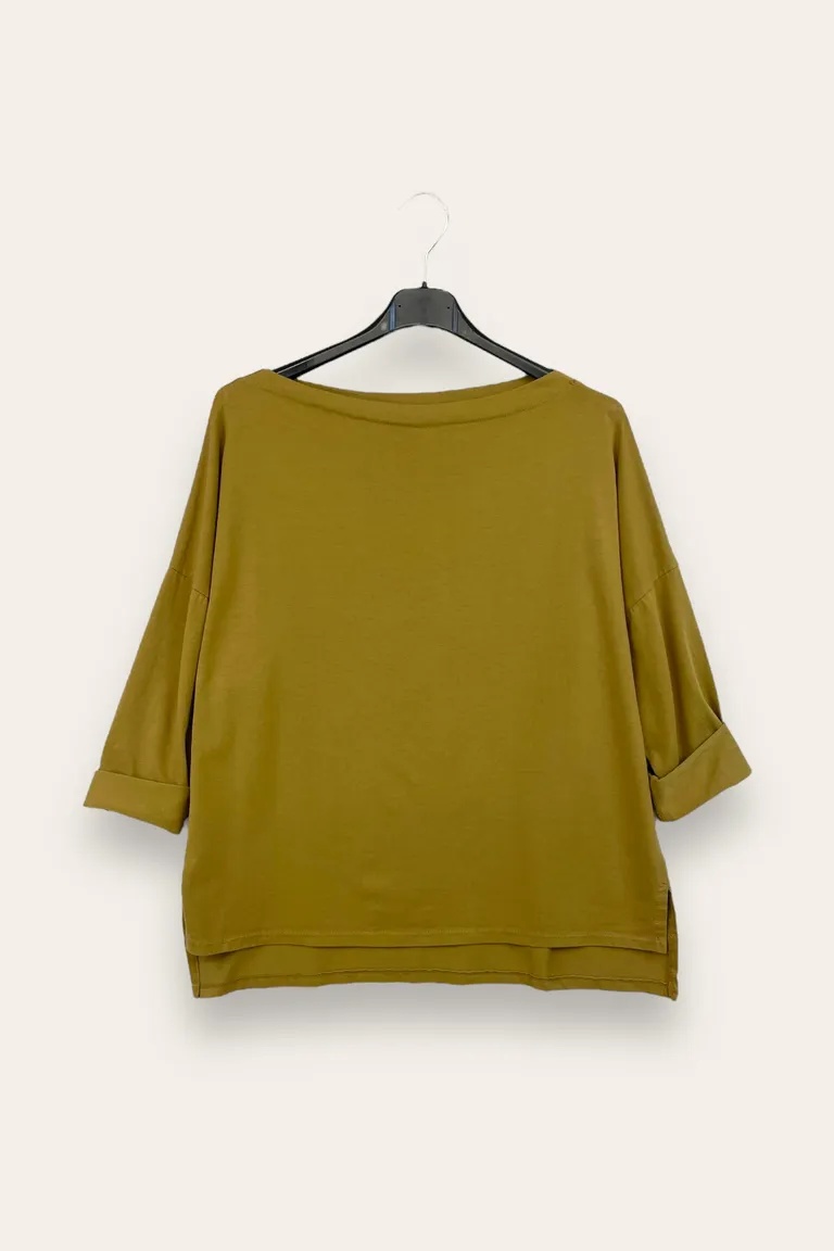 * Maglia a maniche corte con vestibilità morbida* Girocollo ampio* Maniche con risvolto cucito* Fondo leggermente più lungo sul retro* Tessuto leggero e fluido